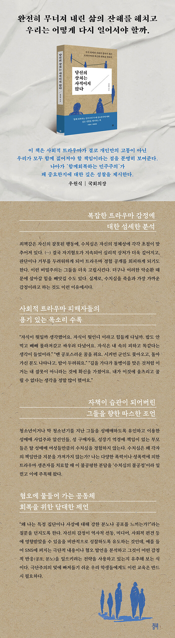 2013³âºÎÅÍ ±¤ÁÖÆ®¶ó¿ì¸¶¼¾ÅÍ¿¡¼ ±¹°¡ Æø·Â »ýÁ¸ÀÚ¿Í À¯°¡Á·À» ´ë»óÀ¸·Î Áõ¾ð Ä¡À¯¸¦ ÇØ¿Â Á¤½Å°Ç°ÀÇÇаú Àü¹®ÀÇ. 5¡¤18 ¹ÎÁÖȿ, ¼¼¿ùÈ£ Âü»ç, Çе¿ ºØ±« »ç°í, Á¦ÁÖÇ×°ø ¿©°´±â Âü»ç µîÀÇ Áý´Ü Æ®¶ó¿ì¸¶ »ç°Ç ÇÇÇØÀÚ ¹× À¯Á·°ú Çлý ÀÚ»ì µîÀÇ Çб³ À§±â »ç°Ç ´ç»çÀÚ, ȼø PC¹æ ³ë¿¹ »ç°Ç ÇÇÇØÀÚ, Å» ¼º¸Å¸Å ¿©¼º µî »çȸÀû Æ®¶ó¿ì¸¶·Î °íÅë¹Þ´Â À̵éÀ» Ä¡À¯ÇÏ°í µ½´Â Àϵ鿡 Âü¿©ÇØ ¿Ô´Ù. Áõ»ó Áß½ÉÀÇ °³ÀÎÀû Ä¡·á¸¦ ³Ñ¾î °øµ¿Ã¼¿¡ ±â¹ÝÇÑ »çȸÀû ȸº¹À» ÁöÇâÇÑ´Ù. 2021³â ¿À¿ù ¾î¸Ó´Ï»óÀ» ¼ö»óÇß°í, ÇöÀç ±¤ÁÖ µ¿¸íº´¿ø ¿øÀåÀ¸·Î ÀÏÇϰí ÀÖ´Ù. ±¹¸³Æ®¶ó¿ì¸¶Ä¡À¯¼¾ÅÍ ÀÚ¹®ÀÇ, 12¡¤29 ¿©°´±â Âü»ç ÇÇÇØÀÚ Áö¿ø ¹× Èñ»ýÀÚ Ã߸ðÀ§¿øÈ¸ À§¿ø, Çѱ¹ Æ®¶ó¿ì¸¶½ºÆ®·¹½ºÇÐȸ ±³À°ºÎÀ§¿øÀå µîÀ¸·Îµµ Ȱ¹ßÈ÷ Ȱµ¿ ÁßÀÌ´Ù. ÇÔ²² ¾´ Ã¥À¸·Î ¡¶±×´ëÀÇ ¸¶À½¿¡ ´ê¾Ò½À´Ï´Ù¡·°¡ ÀÖ´Ù.