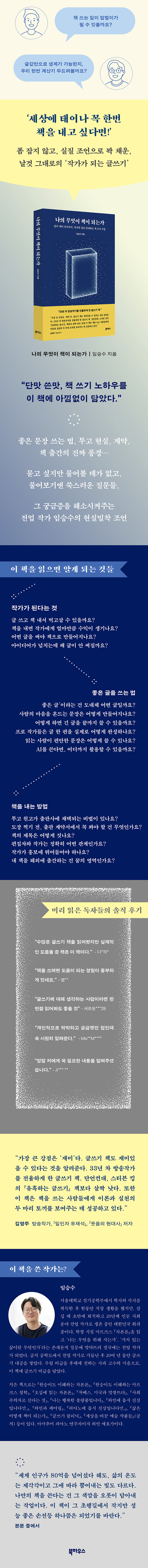 ÀÛ°¡°¡ µÇ°í ½ÍÀº À̵éÀ» À§ÇÑ Ã¥ ¾²±â Ã¥. ÀÌ Ã¥Àº Àӽ¼ö ÀÛ°¡°¡ ´Ù¾çÇÑ ºÐ¾ßÀÇ ±ÛÀ» ¾²¸ç Å͵æÇÑ 20³â Ã¥ ¾²±â ³ëÇϿ츦 ÇÑ ±Ç¿¡ ´ãÀº ±Û¾²±â Ã¥ °áÁ¤ÆÇÀÌ´Ù. °øÇеµ Ãâ½Å ±ÛÄ¡¿¡¼ Àü¾÷ÀÛ°¡°¡ µÈ ÀÛ°¡·Î¼, ±Û·Î ¸Ô°í»ì¸ç ¿Â¸öÀ¸·Î üµæÇÑ ÇÙ½É ºñ¹ýÀ» ³¹³¹ÀÌ °ø°³ÇÑ´Ù. À§Æ® ÀÖ°í °¡µ¶¼º ³ÑÄ¡´Â ±Û¿¡ ºüÁ®µé´Ù º¸¸é, ¾î´À»õ Ã¥ Ãâ°£ÀÇ Å« ±×¸²À» ¸Ó¸´¼Ó¿¡ ±×¸± ¼ö ÀÖ°Ô µÇ´Â Ã¥ÀÌ´Ù. ÁÁÀº ¹®ÀåÀ» ¾²´Â ¹æ¹ýºÎÅÍ, ÁÖÁ¦ ¼±Á¤, Åõ°í, °è¾à, Ã¥ È«º¸±îÁö, Ã¥À» ¾µ ¶§ °Þ°Ô µÇ´Â °Í Áß¿¡¼ °¡Àå ÇÙ½ÉÀûÀÎ ºÎºÐ¸¸ Ãß·Á¼ ¾ê±âÇØÁØ´Ù. ±Û¾²±âÀÇ ³¶¸¸À» ÇÑ ²¨Ç® ¹þ°Ü³ÂÀ» ¶§ µå·¯³ª´Â, ÀÛ°¡ »ýȰÀÇ ¸®¾óÇÑ »î°ú ÃâÆÇ ÇöÀåÀ» »ý»ýÇÑ ¾ð¾î·Î Á¢ÇÒ ¼ö ÀÖ´Ù.