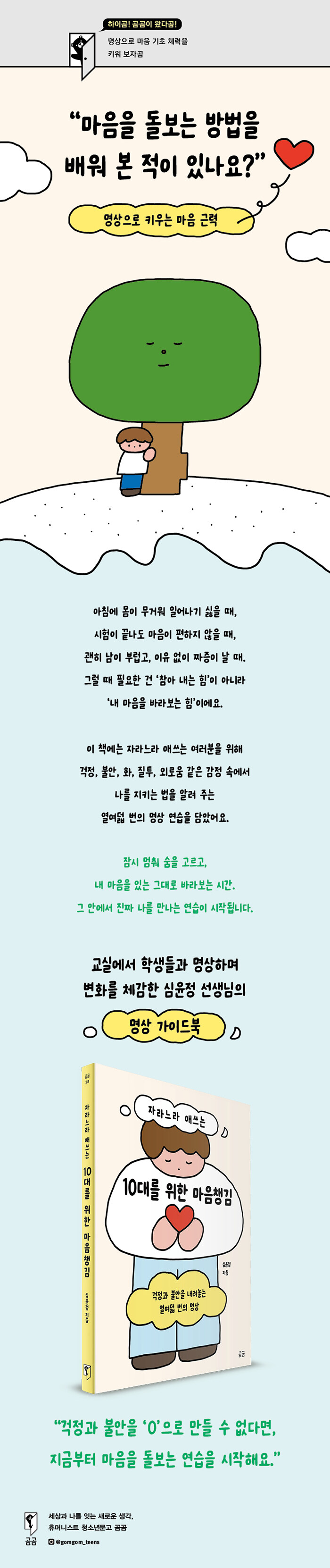 ¡¶ÀÚ¶ó´À¶ó ¾Ö¾²´Â 10´ë¸¦ À§ÇÑ ¸¶À½Ã¬±è¡·Àº ´Ü¼øÈ÷ À§·Î¸¦ ÀüÇϴ åÀÌ ¾Æ´Ï´Ù. ¸í»ó°ú ³ú°úÇÐ?½É¸®ÇÐÀÇ ¿¬±¸¸¦ Åä´ë·Î, û¼Ò³â¿¡°Ô ÀÚ½ÅÀÇ °¨Á¤°ú »ý°¢À» ÀÖ´Â ±×´ë·Î ÀνÄÇÏ°í ´Ù·ç´Â ¹æ¹ýÀ» ¾È³»ÇÑ´Ù. ¸Å À帶´Ù ¸¶À½ °Ç°À» ½ÇÁúÀûÀ¸·Î Áö¿øÇÏ´Â ¸í»ó ÇÁ·Î±×·¥À» üÇèÇÒ ¼ö ÀÖÀ¸¸ç, 5ºÐ ³»¿ÜÀÇ ÂªÀº ºÐ·®À¸·Î ¹Ù»Û ÇÏ·ç ¼Ó¿¡¼µµ ½ÇõÇÒ ¼ö ÀÖ°Ô²û ±¸¼ºÇß´Ù. ªÀº ½Ã°£, Á¶¿ëÇÑ ÀÚ¸®, ¼û ÇÑ ¹øÀÇ ¿©À¯¸¸ ÀÖÀ¸¸é ¡®Áö±Ý, ¿©±â¡¯¿¡¼ ¸¶À½Ã¬±èÀ» ½ÃÀÛÇÒ ¼ö ÀÖ´Ù.