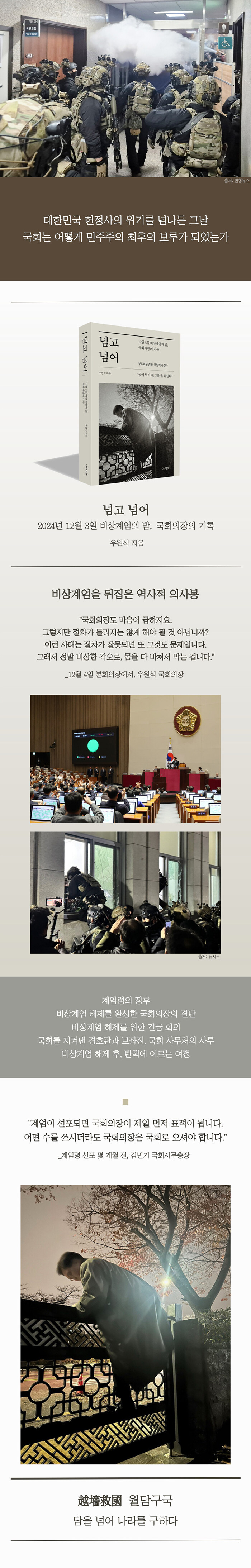 ±¹È¸ÀÇÀåÀÌ °ø°üÀ» ºüÁ®³ª¿Â ¼ø°£ºÎÅÍ ±¹È¸ ´ãÀåÀ» ³Ñ¾î Áý¹«½Ç¿¡ µµÂøÇÏ¿© ÀÛÀüÀ» ¼¼¿ì°í ½ÇÇàÇÏ´Â ±ä¹ÚÇÑ ¿©Á¤À» ±â·ÏÇÑ Ã¥. °è¾öÀ» ÇØÁ¦Çϱâ À§ÇÑ ¹ýÀû ±Ù°Å¿Í ÀÛÀüÀ» °á´ÜÇÏ´Â Àå¸éºÎÅÍ ±¹È¸»ç¹«Ã³ Á÷¿øµéÀÌ ÀÇÀåÀÇ µ¿¼±À» ¼û±â±â À§ÇØ Àü ÃþÀÇ ºÒÀ» ÄѰí À̵¿ÇÏ´ø ¸ð½À, ±ÇÃÑÀ» µç °æÈ£´ë°¡ ÀÚµ¿È±â·Î ¹«ÀåÇÑ °è¾ö±ºÀ¸·ÎºÎÅÍ ±¹È¸ÀÇÀåÀ» º¸È£Çϱâ À§ÇØ °¢¿À¸¦ ´ÙÁ³´ø ±â·ÏÀÌ °ø°³µÈ´Ù. ¡º³Ñ°í ³Ñ¾î¡»´Â ±× Ã¥ÀÓÀÌ ¾î¶² ¹«°Ô¿´´ÂÁö, ±×¸®°í ±× Ã¥ÀÓÀ» ¿Ï¼öÇϱâ À§ÇØ ±¹È¸ Àüü°¡ ¾î¶² ¹æ½ÄÀ¸·Î ¿òÁ÷¿´´ÂÁö¸¦ Ãæ½ÇÇÏ°Ô ´ã¾Ò´Ù.