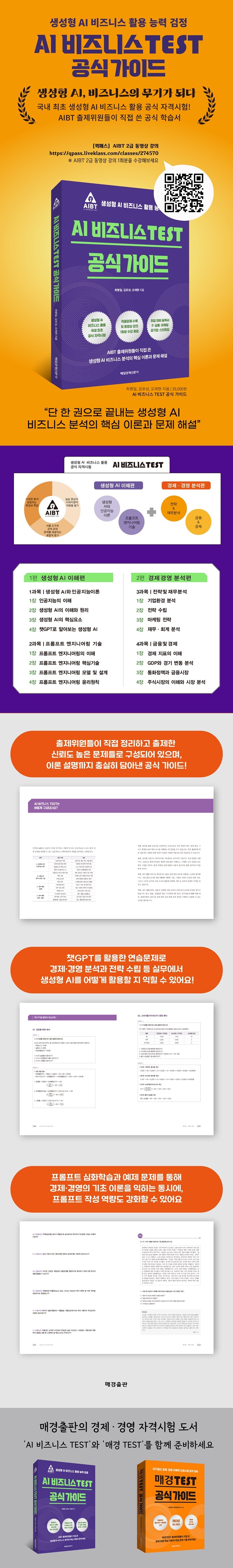 ¡¶AI ºñÁî´Ï½º TEST °ø½Ä °¡À̵塷´Â ÃâÁ¦À§¿øÁøÀÌ Á÷Á¢ ÁýÇÊÇÑ À¯ÀÏÇÑ °ø½Ä ±³Àç·Î, ½ÃÇèÀÇ Àü °úÁ¤À» ÇнÀÇÒ ¼ö ÀÖµµ·Ï ü°èÀûÀ¸·Î ¼³°èµÇ¾ú´Ù. »ý¼ºÇü AIÀÇ ±âº» ¿ø¸®¿Í ÇÁ·ÒÇÁÆ® ¿£Áö´Ï¾î¸µ ±â¼ú, °æ¿µ ºÐ¼®°ú °æÁ¦¡¤±ÝÀ¶ ºÐ¼® µî ½ÃÇèÀÇ ³× °¡Áö ¿µ¿ªÀ» Æø³Ð°Ô ´Ù·ç¸ç, ½Ç¹«¿¡ ¹Ù·Î Àû¿ë °¡´ÉÇÑ Áö½ÄÀ» Á¦°øÇÑ´Ù. ¶ÇÇÑ ÃªGPT¸¦ Ȱ¿ëÇÑ ½Ç½À ¿¹Á¦, ½ÇÁ¦ ±âÃâ ¹®Á¦, ´Ù¾çÇÑ »ê¾÷ ÇöÀåÀÇ ÀÀ¿ë »ç·Ê¸¦ dzºÎÇÏ°Ô ¼ö·ÏÇØ ¼öÇè»ýÀÌ ½ÃÇè Áغñ¸¦ ³Ñ¾î ½ÇÁ¦ ºñÁî´Ï½º ÇöÀå¿¡¼ °æÀï·ÂÀ» È®º¸ÇÒ ¼ö ÀÖµµ·Ï µ½´Â´Ù.