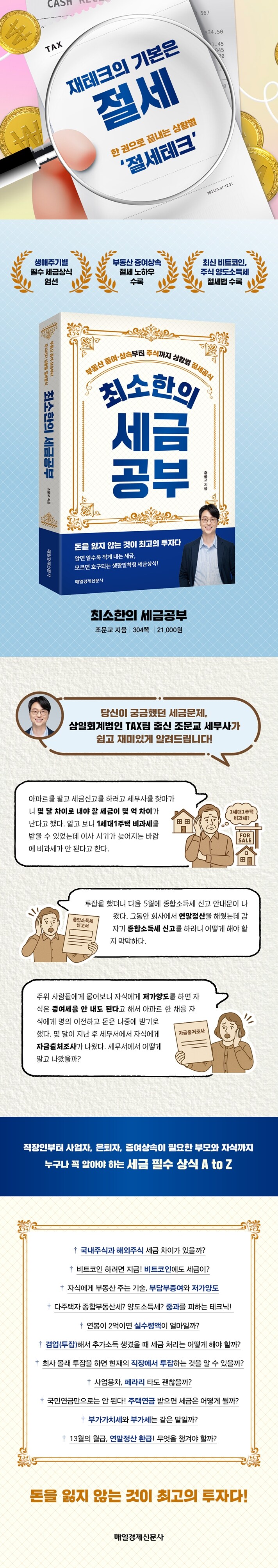ÀúÀÚ Á¶¹®±³ ¼¼¹«»ç´Â »ïÀÏȸ°è¹ýÀο¡¼ °æ·ÂÀ» ½×°í °í·Á´ëÇб³ ´ëÇпø¿¡¼ Á¶¼¼ÀçÁ¤ÇÐÀ» Àü°øÇØ ½Ç¹«¿Í ÀÌ·ÐÀ» µÎ·ç °âºñÇÑ Á¶¼¼ Àü¹®°¡´Ù. Àü ±¹¹ÎÀÌ ¼¼±ÝÀ» ¾ï¿ïÇÏ°Ô ´õ ³»´Â ÀÏÀÌ ¾øµµ·Ï ¼ö¸¹Àº °ÀÇ, ºí·Î±×, À¯Æ©ºê¸¦ ÅëÇØ ¼¼±ÝÀ» ¾Ë±â ½±°Ô ÀüÇϰí ÀÖ´Ù. ¡¶ÃÖ¼ÒÇÑÀÇ ¼¼±Ý°øºÎ¡·¿¡´Â ¼¼±Ý¿¡ ´ëÇÑ °³³äÀ» Àâ¾Æ¾ß ÇÏ´Â 10´ë, 2030 Á÷ÀåÀΡ¤ÇÁ¸®·£¼¡¤»ç¾÷ÀÚ, ÀçÅ×Å©¿Í ºÎµ¿»ê °Å·¡°¡ ÇÊ¿äÇÑ 40´ë, ÀºÅð¿Í Áõ¿©¡¤»ó¼ÓÀ» ÁغñÇØ¾ß ÇÏ´Â 50´ë ÀÌ»ó ºÎ¸ð±îÁö »ý¾ÖÁֱ⺰·Î ¾Ë¾ÆµÎ¸é ³» ÀÚ»êÀ» Áöų ¼ö ÀÖ´Â ¼¼±Ý Áö½ÄÀÌ Ã©Åͺ°·Î »ó¼¼È÷ ¼³¸íµÇ¾î ÀÖ´Ù. ¼¼±Ý Ã¥ÀÌ ¾î·Æ´Ù´Â Æí°ß°ú´Â ´Þ¸®, ±¸Ã¼ÀûÀÎ ÀÏÈÇü »ç·Ê·Î Àç¹ÌÀÖ°Ô ¼³¸íÇØ ½±°Ô ½ï½ï ÀÌÇØµÈ´Ù. ¼¼±Ý°ú °ü·ÃµÈ Èï¹Ì·Î¿î »ó½Äµéµµ dzºÎÈ÷ ´ã¾Ò´Ù. ƯÈ÷ ºÎ¸ð°¡ ¼¼±ÝÀ» ¸ð¸£´Â ¡®¼¼¾Ë¸ø¡¯ Àڳ࿡°Ô ¼±¹°ÇÏ¸é Æò»ý µµ¿òÀÌ µÉ Áö½ÄÀÚ»êÀÌ µÉ °ÍÀÌ´Ù.