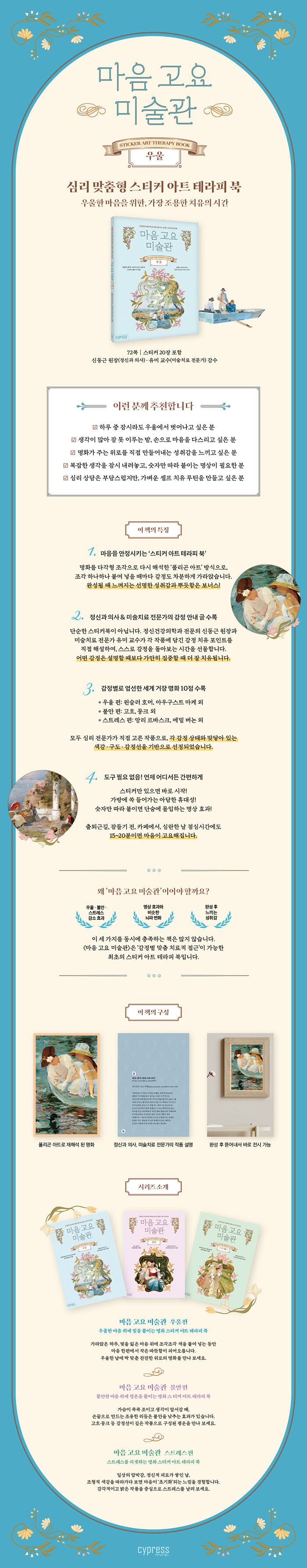 ¡´¸¶À½ °í¿ä ¹Ì¼ú°ü¡µÀÇ Å« Ư¡Àº ½É¸® Àü¹®°¡ÀÇ Àü¹®¼ºÀÌ ´õÇØÁ³´Ù´Â Á¡ÀÌ´Ù. Á¤½Å°ú ÀÇ»ç¿Í ¹Ì¼úÄ¡·á Àü¹®°¡°¡ ÀÛǰÀ» °¨Á¤ °üÁ¡¿¡¼ ÇØ¼®ÇØ, °¢ ¸íȰ¡ ¿Ö ¿ì¿ï¡¤ºÒ¾È¡¤½ºÆ®·¹½º ȸº¹¿¡ µµ¿òÀÌ µÇ´ÂÁö Ä£ÀýÇÏ°Ô ¾È³»ÇÑ´Ù. ÀÌ Ã¥À» °¨¼öÇÑ ½Åµ¿±Ù ¿øÀåÀº ¡°¸íÈ´Â ½Ã´ë¸¦ ÃÊ¿ùÇØ Àΰ£ÀÇ ³»¸éÀ» °¡Àå ¼ÖÁ÷ÇÏ°Ô ´ã¾Æ³½ ½Ã°£ÀÇ ±â·ÏÀÔ´Ï´Ù. Ȱ¡µéÀÌ ±×·Á ³½ °íÅë°ú ½½ÇÄ, Èñ¸Á, ¿ë±â, ±×¸®°í »ç¶ûÀÌ ±³Â÷ÇÏ´Â ¼ö¸¹Àº Àå¸é ¼Ó¿¡¼ ¿ì¸®´Â ÀڽŰú ´àÀº À̾߱⸦ ¹ß°ßÇϰí, ¸¶À½ÀÇ °áÀ» ¾î·ç¸¸Áö°Ô µË´Ï´Ù.¡±¶ó°í ¼³¸íÇϸç, ¸íȸ¦ °¨»óÇÏ´Â °Í¸¸À¸·Îµµ Ä¡À¯Àû È¿°ú°¡ ÀÖÁö¸¸, ½ºÆ¼Ä¿ ÀÛ¾÷Àº Á÷Á¢ âÁ¶Çذ¡´Â Áñ°Å¿òÀ» ÁÖ¸ç Ä¡À¯ È¿°ú¸¦ ´õÇÒ °ÍÀ̶ó°í ¸»Çß´Ù. µ¥ÀÌÅÍ·¦¿¡ µû¸£¸é Áö³ÇØ ½É¸®¡¤Á¤¼ °ü·Ã °Ë»ö¾î Áß ¡®¿ì¿ï¡¯, ¡®ºÒ¾È¡¯, ¡®½ºÆ®·¹½º¡¯°¡ »óÀ§±ÇÀ» ±â·ÏÇß´Ù. ÀÌ Ã¥Àº ´Ü¼øÈ÷ ¿¹»Û Ãë¹Ì Ã¥ÀÌ ¾Æ´Ï¶ó, ½É¸® Áõ»óº°·Î ÇÊ¿äÇÑ ¹Ì¼ú Ä¡À¯ ¿ä¼Ò¸¦ Ã¥ ÇÑ ±Ç¿¡ ´ã¾Æ³½ ÃÖÃÊÀÇ ½ºÆ¼Ä¿ ¾ÆÆ®ºÏÀ̶ó´Â Á¡ÀÌ °¡Àå Å« Â÷º°Á¡ÀÌ´Ù.