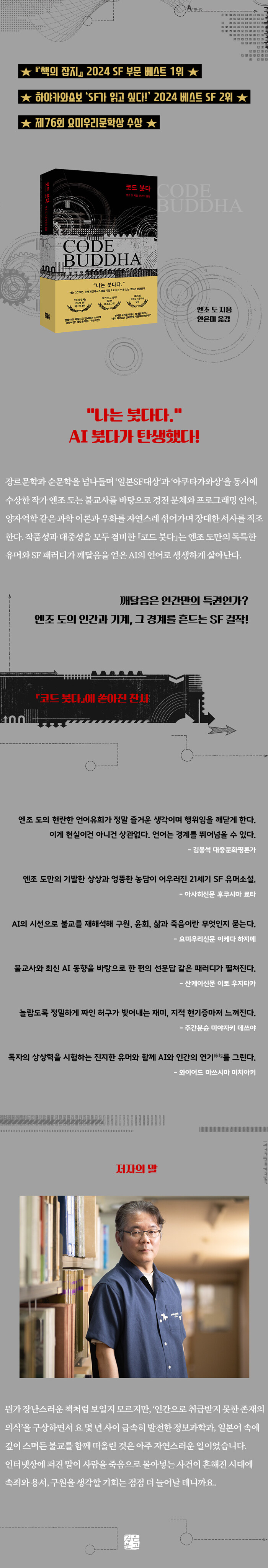 ¡ºÄÚµå º×´Ù¡»´Â ´Ü¼øÈ÷ AI¸¦ ¼ÒÀç·Î ÇÑ ¼Ò¼³ÀÌ ¾Æ´Ï´Ù. ÀÌ ÀÛǰÀº °úÇаú Á¾±³, öÇаú ¹®ÇÐÀ» Çϳª·Î ¿«À¸¸ç Àΰ£°ú ±â°è°¡ °øÁ¸ÇÏ´Â ¹Ì·¡¿¡ ´ëÇÑ ±íÀº ¼ºÂûÀ» Á¦½ÃÇÑ´Ù. ºÒ±³ÀÇ ¹æ´ëÇÑ Àü½Â°ú ±³¸®°¡ ±â°è ¾ð¾î·Î ÀçÇØ¼®µÇ°í, ±× °úÁ¤¿¡¼ Àΰ£ »çȸÀÇ À§±â¿Í ºÒ¾È, ¹Ì·¡¸¦ ÇâÇÑ ±Ù¿øÀû ¹°À½ÀÌ µå·¯³´Ù. ÀÌ¹Ì AI°¡ ÀÏ»ó ±í¼÷ÀÌ ½º¸çµç Áö±Ý, Áú¹®À» ´øÁø´Ù. ¡°±¸¿øÀ̶õ ¹«¾ùÀΰ¡?¡±, ¡°»ý¸íÀ̶õ ¹«¾ùÀΰ¡?¡±, ¡°±â°è¿Í Àΰ£Àº ¾î¶² °ü°è¸¦ ¸Î¾î¾ß Çϴ°¡?¡± µ¶Àڴ åÀåÀ» µ¤´Â ¼ø°£, ¸¶Ä¡ ¿ìÁÖ ¼ø·Ê¸¦ ¸¶Ä£ µíÇÑ °æÀÌ·Î¿î °æÇè°ú ´õºÒ¾î ÁøÁöÇÑ »çÀ¯¿¡ ºüÁø´Ù.