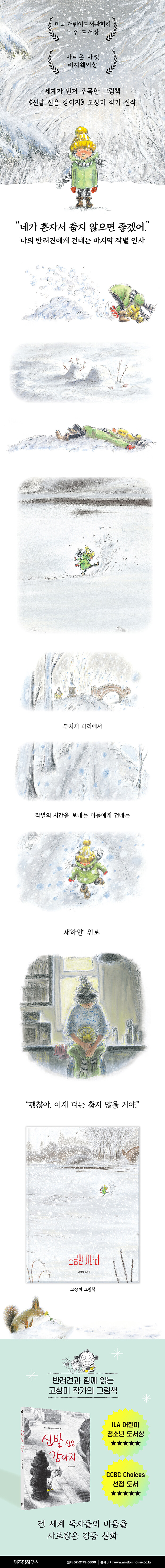 ù Ã¥ ¡¶½Å¹ß ½ÅÀº °¾ÆÁö¡··Î ¹Ì±¹ ¾î¸°À̵µ¼°üÇùȸ ¿ì¼öµµ¼»ó, ¸¶¸®¿Â ¹Ù³Ý ¸®Áö¿þÀÌ»ó, ILA ¾î¸°ÀÌ Ã»¼Ò³â»ó¿¡ ¼±Á¤µÇ¸ç ¼¼°èÀÎÀÇ ÁÖ¸ñÀ» ¹Þ¾Ò´ø °í»ó¹Ì ÀÛ°¡ÀÇ µÎ ¹øÂ° ±×¸²Ã¥ÀÔ´Ï´Ù. ÀÌ Ã¥Àº ÀÛ°¡ÀÇ ¾ð´Ï°¡ ¹Ý·Á°ß ·¹À̸¦ ¶°³ªº¸³Â´ø ½ÇÁ¦ À̾߱⸦ ´ã¾Æ³½ °ÍÀÔ´Ï´Ù. ¾ð´Ï´Â ´ã´ãÈ÷ ¸»ÇßÁö¸¸, ÀÛ°¡´Â ´«¹°À» È긮¸ç µé¾ú´Ù°í ÇÕ´Ï´Ù. ½ÇÁ¦ ¹Ý·Á°ß°ú »ì°í Àֱ⵵ ÇÑ ÀÛ°¡´Â, ±×¶§ ÀÚ½ÅÀÌ ´À²¼´ø ¹¶Å¬ÇÏ°í µû¶æÇÑ ¸¶À½ÀÌ µ¶ÀÚ¿¡°Ô ÀüÇØÁö±æ ¹Ù¶ó¸ç ÀÌ Ã¥À» ¸¸µé¾ú½À´Ï´Ù. ÀÛ°¡ ƯÀ¯ÀÇ À¯¿¬ÇÑ ¼±À¸·Î ºú¾î³»´Â »ç¶û½º·¯¿î ij¸¯Å͵é°ú ÆÄ½ºÅÚÀÇ ºÎµå·¯¿î Áú°¨À¸·Î ½×¾Æ ¿Ã¸° ÇÏ¾á °Ü¿ï dz°æÀ¸·Î °¡±î¿î Ä£±¸ÀÌÀÚ °¡Á·À» ¸Ö¸® º¸³½ ¾î¸°ÀÌÀÇ ¸¶À½À» ´ã´ãÇÏ°í ¾ÖÆ¶ÇÏ°Ô ±×·Á³À´Ï´Ù. °í¿äÈ÷ ³»¸®´Â ´«¼ÛÀÌó·³ ¼Ò·Ï¼Ò·Ï ¸¶À½¿¡ ½×¿© ¿À·¡ ±â¾ïµÉ ¾Æ¸§´Ù¿î ±×¸²Ã¥ÀÔ´Ï´Ù.