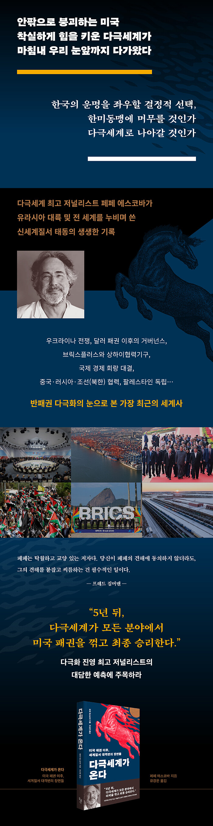 ´Ù±ØÈ Áø¿µ ÃÖ°í Àú³Î¸®½ºÆ®, ºê¶óÁú Ãâ½Å ÁöÁ¤ÇÐ ºÐ¼®°¡ ÆäÆä ¿¡½ºÄÚ¹ÙÀÇ Ã¥ÀÌ µåµð¾î Çѱ¹¿¡ ¼Ò°³µÈ´Ù. Áö³ 20³â µ¿¾È ¹Ì±¹ ÆÐ±Ç ±×¸®°í ±×¿¡ ´ëÇ×ÇÏ´Â ±Û·Î¹ú»ç¿ì½ºÀÇ ¼¼°èÁ¤¼¼¸¦ Ä¡¿ÇÏ°Ô Å½±¸ÇÏ¸ç »ýµ¿°¨ ³ÑÄ¡´Â ºÐ¼®À¸·Î ¸í¼ºÀ» ½×¾Æ ¿Â ÀúÀÚ´Â, ¡º´Ù±Ø¼¼°è°¡ ¿Â´Ù¡»¸¦ ÅëÇØ ¸¶Ä§³» ¡°È»êó·³ ¼Ú±¸Ä¡´Â ÁöÁ¤ÇÐÀû ºÐ±âÁ¡¿¡¼ ¿ª»çÀÇ ÃʾÈÀ» ³¯°Í ±×´ë·Î °ËÅä¡±ÇØ³Â´Ù. ¹Ì±¹ ÆÐ±Ç ¾ø´Â ´Ù±Ø¼¼°è°¡ ¾î¶»°Ô ÁغñµÇ¾î¿Ô´ÂÁö, ¹ÝÆÐ±Ç ´Ù±ØÈÀÇ ´«À¸·Î 2020³â´ëÀÇ °¡Àå ÃÖ±Ù ¼¼°è»ç¸¦ ±â·ÏÇß´Ù. ¿ìÅ©¶óÀ̳ª ÀüÀï, ´Þ·¯ ÆÐ±Ç ÀÌÈÄ, BRICS+¿Í SCO, ±¹Á¦ °æÁ¦ ȸ¶û ´ë°á, Áß±¹¡¤·¯½Ã¾Æ¡¤Á¶¼±(ºÏÇÑ) Çù·Â, ÆÈ·¹½ºÅ¸ÀÎ µ¶¸³ µî ¿ì¸® ½Ã´ë ¼¼°èÁ¤¼¼ÀÇ °¡Àå ÷¿¹ÇÑ ¹®Á¦µéÀ» À¯¶ó½Ã¾Æ ´ë·ú°ú Àü ¼¼°è¸¦ Á÷Á¢ ´©ºñ¸ç º¸°í µè°í ºÐ¼®Çß´Ù. ¿ì¸®°¡ ÁÖ·Î Á¢ÇØ ¿Â ¼¹æÀÇ ¼¼°èÁ¤¼¼ ºÐ¼®°ú ºñ±³Çϸé, ´Ù±Ø¼¼°è ±Ç¿ªÀ» ¡®ºÐ¼® ´ë»ó¡¯ÀÌ ¾Æ´Ñ ¡®Çൿ ÁÖü¡¯·Î ¼³Á¤Çϰí, ¶§·Î´Â Àü¼± Áö¿ª ÃëÀç±îÁö ¸¶´ÙÇÏÁö ¾Ê°í ±¸Ã¼ÀûÀÎ ÇöÀ强°ú Àü¹®ÀûÀÎ Àú³Î¸®ÁòÀ» °áÇÕÇß´Ù´Â Á¡¿¡¼ ½Å¼±Çϰí Èï¹Ì·Ó´Ù.