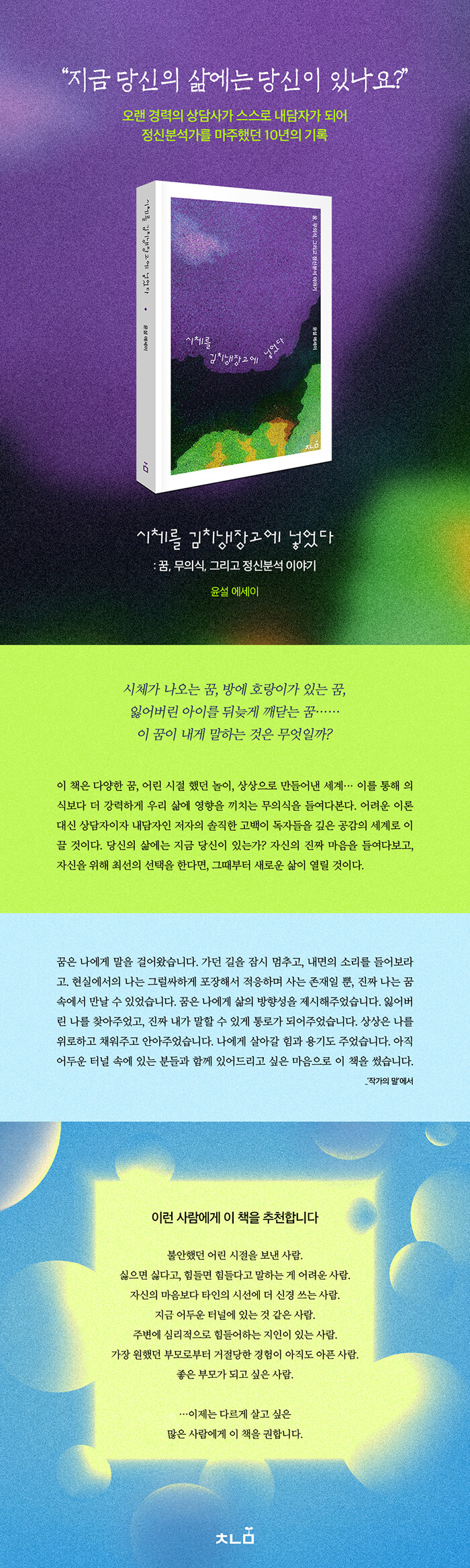 ¿ì¸®´Â ¸¶Ä¡ ÀÚ½ÅÀÌ ³ºÀº ¾Æ±âÀÇ Á¸À縦 ±î¸Ä°Ô ÀØÀº ¾ö¸¶Ã³·³ ½º½º·Î¸¦ ÀØ°í »ì¾Æ°¡´Â °ÍÀº ¾Æ´Ò±î? ÀÌ Ã¥Àº ¿À·§µ¿¾È ³»´ãÀÚ¸¦ ¸¸³ª »ó´ãÀ» Çß´ø ÀúÀÚ°¡ ½º½º·Î ³»´ãÀÚ°¡ µÇ¾î Á¤½ÅºÐ¼®°¡¿¡°Ô ºÐ¼® ¹ÞÀº ±â·ÏÀ» ´ã¾Ò´Ù. ²Þ, ¾î¸° ½ÃÀý Çß´ø ³îÀÌ, »ó»óÀ¸·Î ¸¸µé¾î³½ ¼¼°è¡¦ À̸¦ ÅëÇØ Àǽĺ¸´Ù ´õ °·ÂÇÏ°Ô ¿ì¸®ÀÇ »î¿¡ ¿µÇâÀ» ³¢Ä¡´Â ¹«ÀǽÄÀ» µé¿©´Ùº»´Ù. ¾î·Á¿î ÀÌ·Ð ´ë½Å »ó´ãÀÚÀÌÀÚ ³»´ãÀÚÀÎ ÀúÀÚÀÇ ºÒ¾È°ú ¿ì¿ï, ²Þ°ú »ó»óÀ» ºÐ¼®ÇÑ °æÇèÀ» Áø¼ÖÇÏ°Ô ±×·Á³»°í ÀÖ¾î, µ¶ÀÚµéÀÇ ÀÌÇØ¿Í °ø°¨¿¡ ½±°Ô ´Ù°¡°¡°í ÀÖ´Ù.