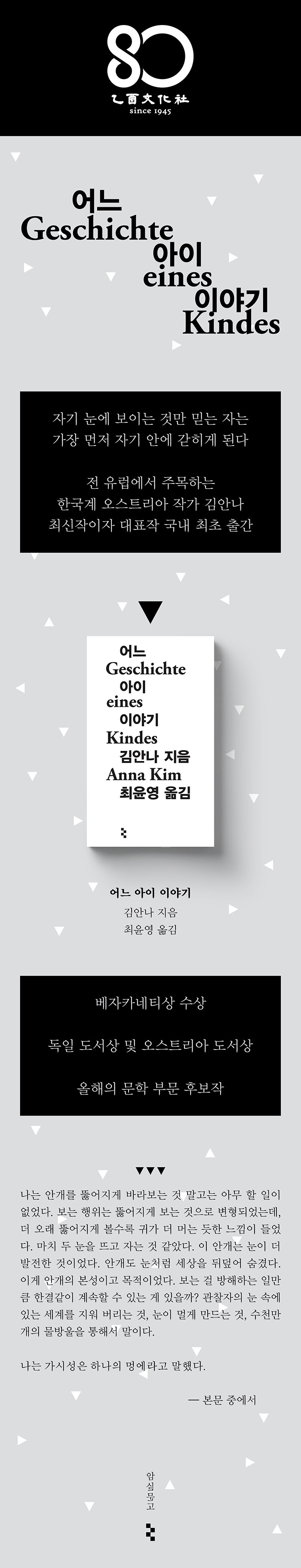 ¹Ù·Î ÀÌ ÁöÁ¡¿¡¼ ¡º¾î´À ¾ÆÀÌ À̾߱⡻´Â ¶Ù¾î³ ¼Ò¼³ÀÓÀ» Áõ¸íÇÑ´Ù. ÀÌ ÀÛǰÀº Â÷º°¹Þ´Â ÇÇÇØÀÚ°¡ ¿ª°æÀ» ±Øº¹Çϰųª ¾Æ½±°Ô ½ÇÆÐÇÑ´Ù´Â ´Ü¼øÇÑ ±¸µµ¸¦ ÇÇÇÑ´Ù. ±è¾È³ª´Â Àڱ⠳ª¸§´ë·Î ÃÖ¼±ÀÇ ¹æ¾ÈÀ» ¶°¿Ã¸®°í ¼±ÇÑ °á½ÉÀ» ±»Èù Àι°µéÀÌ ¼·Î ´Ù¸¥ °á·ÐÀ» ÇâÇÏ¸é¼ µÚ¾ûÄÑ ¹ö¸®´Â ¸ð½ÀÀ» ¼±¸íÈ÷ ±×·Á ³½´Ù. ƯÈ÷ 1950³â´ë µ¶ÀÏ¿¡¼ ±Þ¼ºÀåÇÑ ¡®ÀηùÇÐÀû¡¯ Áö½ÄÀ» µ¿¿øÇØ È¥Ç÷ ¾ÆÀÌ¿¡°Ô °¡Àå ÁÁÀº »îÀ» ¼±»çÇÏ·Á ¾Ö¾²´Â ¼±ÇÑ Àι°Àº ÀÌ ¼Ò¼³ ¼ÓÀÇ ¾ÆÀÌ·¯´ÏÇÑ Àι°µé °¡¿îµ¥ °¡Àå °·ÄÇÑ ÈûÀ» ǰ°í ÀÖÀ¸¸ç, ÀÌ·¯ÇÑ ¾ÆÀÌ·¯´Ï´Â ¼¼»ó ¸ðµç Àΰ£ÀÌ Àڱ⵵ ¸ð¸£°Ô ¸¸µé¾îÁø Æí°ß ¼Ó¿¡¼ Æò»ýÀ» »ì¾Æ°¡¾ß ÇÑ´Ù´Â ºñ±ØÀûÀÎ °íÂû°ú ¸Â´ê¾Æ ÀÖ´Ù.
