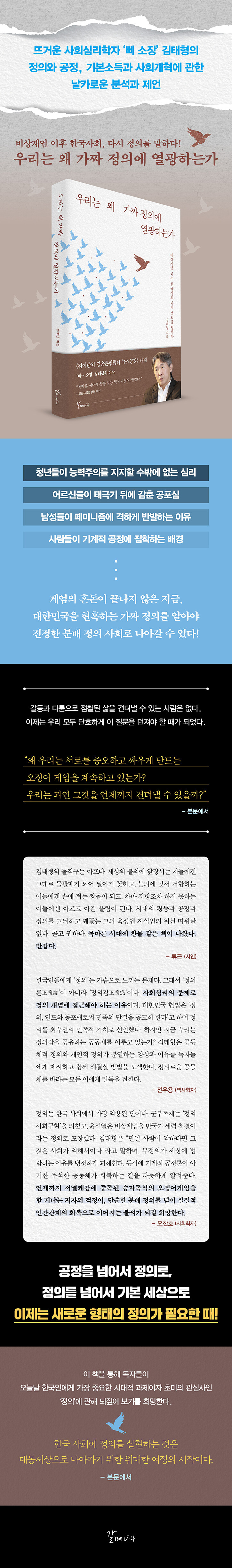¡¶°¡Â¥ ÀÚÁ¸°¨ ±ÇÇÏ´Â »çȸ¡·¡¤¡¶°¡Â¥ Çູ ±ÇÇÏ´Â »çȸ¡·¡¤¡¶°¡Â¥ »ç¶û ±ÇÇÏ´Â »çȸ¡· ¿¬ÀÛÀ» ÅëÇØ °³ÀÎÀÇ ½É¸® ¹®Á¦¿Í Çѱ¹ »çȸÀÇ Àΰú°ü°è¸¦ ¹àÈ÷°í ÁÖ·ù ½É¸®ÇÐÀÇ ÇѰ踦 ³¯Ä«·Ó°Ô ºñÆÇÇÑ ¡®½Î¿ì´Â »çȸ½É¸®ÇÐÀÚ¡¯ ±èÅÂÇüÀÌ À̹ø¿¡´Â ¡®Á¤ÀÇ¡¯¸¦ ÁÖÁ¦·Î Çѱ¹ »çȸÀÇ ¸¶À½À» Áø´ÜÇÑ´Ù. ¡¶¿ì¸®´Â ¿Ö °¡Â¥ Á¤ÀÇ¿¡ ¿±¤Çϴ°¡¡·´Â Çѱ¹ »çȸ¿¡ ¹ü¶÷ÇÏ´Â ´Ù¾çÇÑ Á¤ÀÇ·ÐÀÇ ¹è°æ°ú ÁöÇâÁ¡, ºñÆÇÁ¡À» ºÐ¼®ÇÏ°í ¾î¶»°Ô ÇÏ¸é ¿ì¸® »çȸ°¡ ÁøÁ¤ÇÑ Á¤ÀÇ·Î ³ª¾Æ°¥ ¼ö ÀÖ´ÂÁö Á¦½ÃÇϴ åÀÌ´Ù. ÀúÀÚ´Â ´É·ÂÁÖÀÇ, ±â°èÀû °øÁ¤, ÀýÂ÷Àû Á¤ÀÇ, Æä¹Ì´ÏÁò, PCÁÖÀÇ µî ¿ì¸® »çȸ Á¤ÀÇ·ÐÀÇ °¡Àå ÷¿¹ÇÑ ÈµÎ¸¦ °ú°¨ÇÏ°Ô ³íÇϸç, ±× ¾Æ·¡¿¡ ±ò¸° ½É¸® ±âÁ¦¸¦ ¸íÄèÇÏ°Ô ÇØ¼³ÇÑ´Ù. ÀúÀÚ´Â ¸ðµÎ°¡ ¼Ò¸® ³ô¿© °¢ÀÚÀÇ Á¤ÀǸ¦ ¸»ÇÏ´Â ÀÛ±ÝÀÇ ¼¼Å´ °á±¹ »ýÁ¸ºÒ¾ÈÀ¸·ÎºÎÅÍ ±âÀÎÇÑ ¡®»ç¶÷´ä°Ô »ì°í ½Í´Ù¡¯´Â ¿ÜħÀÇ ¶Ç ´Ù¸¥ ÇüÅÂ¶ó ¸»ÇÑ´Ù.