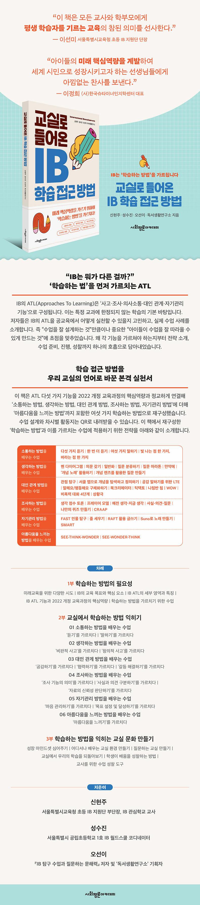 1ºÎ¿¡¼ IBÀÇ ±³À° ¸ñÇ¥¿Í ÇÙ½É ¿ä¼Ò, ATLÀÇ ¼¼ºÎ ¿µ¿ª°ú Ư¡À» ¤°í, ATL°ú 2022 °³Á¤ ±³À°°úÁ¤ÀÇ ¿¬°á ÁöÁ¡À» Á¤¸®ÇÑ µÚ, ¿ì¸® ±³½Ç¿¡¼ ÇнÀÇÏ´Â ¹æ¹ýÀ» °¡¸£Ä¡±â À§ÇÑ ¼ö¾÷ ¼³°èÀÇ Æ²À» Á¦½ÃÇÑ´Ù. 2ºÎ¿¡¼´Â ¿©¼¸ °¡Áö ÇнÀÇÏ´Â ¹æ¹ýÀ» ½ÇÁ¦ ¼ö¾÷À¸·Î ±¸ÇöÇÑ »ç·Ê¸¦ ¡®¼ö¾÷ Àü·«-¼ö¾÷ ÁغñÇϱâ-¼ö¾÷ ÁøÇàÇϱâ-¼ö¾÷ ¼ºÂûÇϱ⡯ÀÇ È帧À¸·Î »ó¼¼È÷ ¾È³»Çϸç, µè±â¡¤¸»Çϱ⡤ºñÆÇÀû »ç°í¡¤Ã¢ÀÇÀû »ç°í¡¤°ø°¨¡¤Çù·Â¡¤°¥µî ÇØ°á¡¤ÀÚ·áÀÇ ½Å·Ú¼º ÆÇ´Ü¡¤¸ñÇ¥ ¼³Á¤ µî ±³½Ç¿¡¼ ¸¶ÁÖÄ¡´Â ±¸Ã¼Àû Àå¸éÀ» ´Ù·é´Ù. 3ºÎ´Â ¼ºÀå ¸¶Àεå¼Â, ¾îµð¼³ª ¹è¿ì´Â ±³½Ç ȯ°æ, Áú¹®ÇÏ´Â ±³½Ç, ±³»ç¿Í ÇлýÀÇ ¼ºÂû µµ±¸ µî ¡®ÇнÀÇÏ´Â ¹æ¹ýÀ» ÀÍÈ÷´Â ±³½Ç ¹®È¡¯±îÁö È®ÀåÇØ Á¦¾ÈÇÑ´Ù. Á¤±Ô ±³°ú´Â ¹°·Ð Çб³ ÀÚÀ²½Ã°£¡¤Ã¢ÀÇÀû üÇè Ȱµ¿¡¤¹æÇÐ Áß µ¶¼/IB Ä·ÇÁ¿¡µµ Àû¿ëÇÒ ¼ö ÀÖ°í, °¢ Àü·«º° Ȱµ¿Áö´Â QR ÄÚµå·Î Á¦°øµÇ¾î ÇöÀå Ȱ¿ë¼ºÀ» ³ô¿´´Ù.