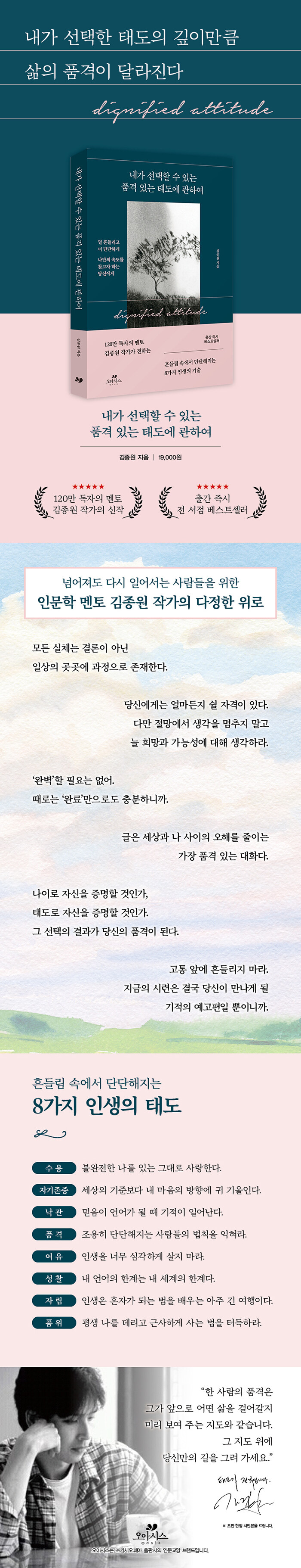 120¸¸ µ¶ÀÚÀÇ ¸àÅä·Î ÀÚ¸® ÀâÀº ±èÁ¾¿ø ÀÛ°¡´Â À̹ø ½ÅÀÛ¿¡¼ ¼ö¿ë¡¤ÀÚ±âÁ¸Áß¡¤³«°ü¡¤Ç°°Ý¡¤¿©À¯¡¤¼ºÂû¡¤ÀÚ¸³¡¤Ç°À§¶ó´Â ¿©´ü °¡Áö Àλý ŵµ¸¦ Áß½ÉÀ¸·Î, Èçµé¸² ¼Ó¿¡¼µµ ÀÚ½ÅÀ» ¹Ù·Î ¼¼¿ì´Â »îÀÇ ±â¼úÀ» Ç®¾î³½´Ù. ªÀº ¹®Àå ¼Ó¿¡ ±íÀº »çÀ¯¸¦ ´ã¾Æ³»´Â ±×ÀÇ ±ÛÀº µ¶ÀÚ¿¡°Ô ¡®Áö±ÝÀÇ ³ª¸¦ ÁöŰ´Â ´õ ǰ°Ý ÀÖ´Â ¼±Åá¯À» Çö½ÇÀûÀ¸·Î ¸¶ÁÖÇÏ°Ô ÇÑ´Ù. ÀÌ Ã¥Àº ´ú Èçµé¸®°í, ´õ ´Ü´ÜÇÏ°Ô ³ª¸¸ÀÇ ¼Óµµ¸¦ ȸº¹ÇÏ¸ç »ì¾Æ°¡´Â ¹ýÀ» Â÷ºÐÈ÷ ¾È³»ÇÏ´Â, Á¶¿ëÇÏÁö¸¸ °·ÂÇÑ »îÀÇ µ¿¹ÝÀÚ°¡ µÇ¾î ÁÙ °ÍÀÌ´Ù.