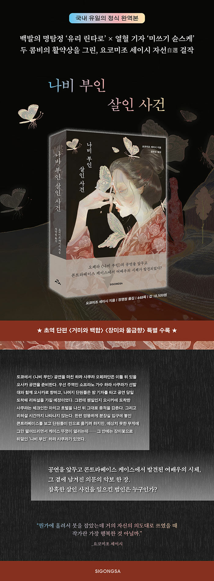 ¿¡µµ°¡¿Í ¶õÆ÷¿Í ÇÔ²² ÀϺ» Ã߸®¼Ò¼³ÀÇ Åä´ë¸¦ ½×Àº °ÅÀå ¡®¿äÄÚ¹ÌÁ¶ ¼¼À̽á¯. 1921³â ´ÜÆí <¹«¼¿î ¸¸¿ìÀý>·Î µ¥ºßÇØ 1981³â ¼¼»óÀ» ¶°³ª±â±îÁö ¹«·Á 60³â°£ Çö¿ª ÀÛ°¡·Î¼ Á¤·ÂÀûÀ¸·Î ÀÛǰ Ȱµ¿À» ÆîÄ£ ±×´Â Ã߸®¼Ò¼³»ç¿¡ ±æÀÌ ³²À» °ÉÀÛµéÀ» ¹«¼öÇÏ°Ô ½á³Â´Ù. ±×Áß¿¡¼µµ °£ÆÇÀ̶ó ÇÒ ¼ö ÀÖ´Â °ÍÀÌ, ¿À´Ã³¯ ÀϺ»ÀÇ ±¹¹Î ŽÁ¤ÀÌÀÚ ¸íŽÁ¤ÀÇ ´ë¸í»ç·Î ºÒ¸®´Â ¡®±ä´ÙÀÌÄ¡ °í½ºÄÉ¡¯ ½Ã¸®Áî. 1946³â ¡¶È¥Áø »ìÀÎ »ç°Ç¡·¿¡ óÀ½ µîÀåÇÑ ÀÌ·¡ ¸¶Áö¸· ÀåÆí ¡¶¾Ç·Éµµ¡·±îÁö ÃÑ 77ÆíÀÇ ÀÛǰ¿¡¼ Ȱ¾àÇÑ ÀÌ ¸íŽÁ¤Àº ÀÛ°¡ ¿äÄÚ¹ÌÁ¶ ¼¼À̽ÃÀÇ À̸§À» µéÀ¸¸é ÀÚµ¿À¸·Î ¶°¿À¸£´Â ºÐ½Å °°Àº ij¸¯ÅÍ´Ù. ±×·±µ¥ ¡®±ä´ÙÀÌÄ¡ °í½ºÄÉ¡¯ ÀÌÀü¿¡ ¿äÄÚ¹ÌÁ¶ ¼¼À̽ð¡ ź»ý½ÃŲ ¶Ç ÇÑ ¸íÀÇ ¸íŽÁ¤ÀÌ ÀÖ¾ú´Ù. ±ä´ÙÀÌÄ¡ °í½ºÄɰ¡ Á¾Àü ÈÄ ÀÛ°¡ÀÇ ÃѾÆõÁä®¶ó¸é, ±× ÀÌÀüÀÇ ÀÛǰµé¿¡¼ °¡Àå µ¸º¸ÀÎ Àι°Àº (ÀåÆíÀ» ±âÁØÀ¸·Î) ¡¶½ÅÁַΡ·ºÎÅÍ ¡¶³ªºñ ºÎÀÎ »ìÀÎ »ç°Ç¡·±îÁö 10¿© ³â°£ ¸ÍȰ¾àÇÑ À¯¸® ¸°Å¸·Î¿´´Ù. ÇѶ§ °æ½Ãû ¼ö»ç°úÀåÀ» Áö³½, ¿ÂÈÄÇÑ ¼º°ÝÀÇ Á߳⠹é¹ß ¸íŽÁ¤. ¸¶Ä¡ ¼È·Ï°ú ¿Ó½¼Ã³·³, ½Å¹®±âÀÚ ¹Ì¾²±â 슌½ºÄÉ¿Í ÇÔ²² »ç°ÇÀ» ÇØ°áÇØ ¡®À¯¸®¡¤¹Ì¾²±â¡¯ ½Ã¸®Áî·Î ºÒ¸®±âµµ ÇÏ´Â ¡®À¯¸® ¸°Å¸·Î¡¯ ½Ã¸®Áî´Â ¡¶È¥Áø »ìÀÎ »ç°Ç¡·°ú µ¿½Ã ¿¬ÀçÇÑ ¡¶³ªºñ ºÎÀÎ »ìÀÎ »ç°Ç¡·À» ³¡À¸·Î ÀÚ¿¬½º·¹ ¡®±ä´ÙÀÌÄ¡ °í½ºÄÉ¡¯ ½Ã¸®Áî¿¡ ¿ÕÁ¸¦ ³Ñ°ÜÁÖ°í »ç¶óÁ³Áö¸¸, ±× ÀÌÀü±îÁö ¿äÄÚ¹ÌÁ¶ ÀÛǰµéÀÌ º¸¿´´ø ³¶¸¸ÀûÀ̰í Ž¹ÌÀûÀÎ ÀÛdzÀ» ³Ñ¾î¼ º»°ÝÀûÀ¸·Î ¼±¸½Ä ³í¸®Àû Ã߸®¿ÍÀÇ À¶ÇÕÀ» ½ÃµµÇÏ¸ç ¡®±ä´ÙÀÌÄ¡ °í½ºÄÉ¡¯ ½Ã¸®ÁîÀÇ ±³µÎº¸ ¿ªÇÒÀ» ÇÑ °ÍÀ¸·Î Æò°¡¹Þ´Â´Ù. ±×Áß¿¡¼µµ ù ¹øÂ° ÀåÆí ¡¶½ÅÁַΡ·¿Í ¸¶Áö¸· ÀåÆí ¡¶³ªºñ ºÎÀÎ »ìÀÎ »ç°Ç¡·Àº ÆÒµéÀº ¹°·Ð, ÀÛ°¡ ½º½º·Îµµ Àü ÀÛǰÀ» ÅëÆ²¾î º£½ºÆ® 10¿¡ ²Å¾Ò´ø ´ëÇ¥ÀÛÀÌ´Ù. ½Ã°ø»ç´Â 2005³â ¡¶¿Á¹®µµ¡·¸¦ ½ÃÀÛÀ¸·Î ±ä ½Ã°£ º¯ÇÔ¾ø´Â »ç¶ûÀ» º¸³»ÁØ Çѱ¹ µ¶ÀÚµéÀ» À§Çؼ, 2025³â 6¿ù ¡®À¯¸® ¸°Å¸·Î¡¯ ½Ã¸®ÁîÀÇ Ã¹ ÀåÆí ¡¶½ÅÁַΡ·¸¦ ¼±º¸ÀÎ µ¥ À̾î, 12¿ù¿¡´Â ¸¶Áö¸· ÀåÆí ¡¶³ªºñ ºÎÀÎ »ìÀÎ »ç°Ç¡·À» Á¤½ÄÀ¸·Î ¹ø¿ªÇØ ¼Ò°³ÇÑ´Ù. ¡¶³ªºñ ºÎÀÎ »ìÀÎ »ç°Ç¡·¿¡´Â ¡¶½ÅÁַΡ·¿¡¼ º¼ ¼ö ¾ø¾ú´ø ÆÄÆ®³Ê ¹Ì¾²±â 슌½ºÄɵµ µîÀåÇÏ¿© À¯¸®¿Í ȯ»óÀÇ È£ÈíÀ» ÆîÄ£´Ù. ¶ÇÇÑ Ç¥Á¦ÀÛ ¿Ü¿¡µµ À¯¸®¡¤¹Ì¾²±â ÄÞºñÀÇ È°¾à»óÀ» ¿³º¼ ¼ö ÀÖ´Â ÃÊ¿ª ´ÜÆí <°Å¹Ì¿Í ¹éÇÕ> <Àå¹Ì¿Í ¿ï±ÝÇâ>À» Ãß°¡ ¼ö·ÏÇÏ¿© ½ÅÀÛÀ» ±â´Ù·Á¿Â µ¶Àڵ鿡°Ô ´õ¿í dz¼ºÇÑ ÀÐÀ»°Å¸®¸¦ ¼±»çÇÑ´Ù.