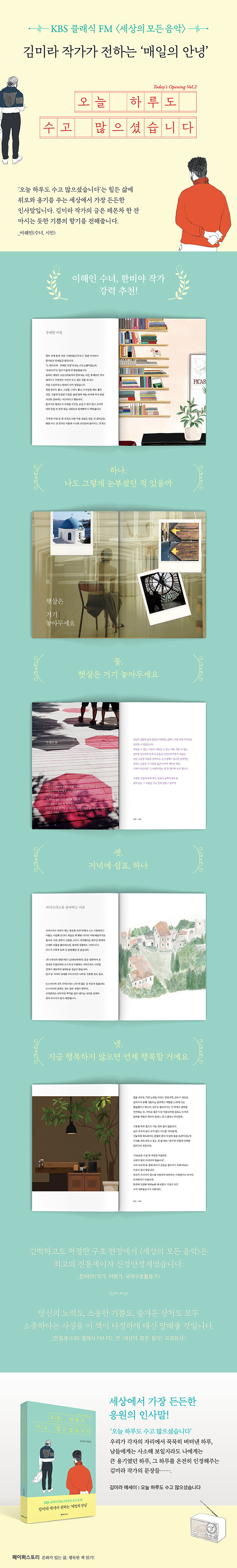 ¾îµÒÀÌ ³»·Á¾É´Â ¸ÅÀÏ Àú³á 6½Ã, ¾î±è¾øÀÌ ¿ì¸®¸¦ ã¾Æ¿Í Àú³á±æÀ» ÀºÀºÇÏ°Ô ¹àÇôÁÖ´Â KBS Ŭ·¡½Ä FM ¡´¼¼»óÀÇ ¸ðµç À½¾Ç¡µ. ÀÌ ÇÁ·Î±×·¥ÀÌ ½ÃÀÛµÈ 2002³â º½ºÎÅÍ Áö±Ý±îÁö ¡´¼¼»óÀÇ ¸ðµç À½¾Ç¡µÀÇ ¹æ¼Û ¿ø°í¸¦ ¾²°í ÀÖ´Â ´ëÇѹα¹ ´ëÇ¥ ¶óµð¿À ÀÛ°¡ ±è¹Ì¶óÀÇ ½Å°£ ¿¡¼¼ÀÌ ¡º¿À´Ã ÇÏ·çµµ ¼ö°í ¸¹À¸¼Ì½À´Ï´Ù¡»°¡ Ãâ°£µÇ¾ú´Ù. ÀÌ Ã¥Àº ÀÛ°¡°¡ ±×µ¿¾È ¹æ¼Û¿¡¼ ¼Ò°³ÇÑ °¨µ¿ÀûÀÎ ¿ÀÇÁ´×°ú, ¹æ¼Û¿¡¼ ¸ø´ÙÇÑ À̾߱⸦ ´ãÀº ¿¡¼¼ÀÌÁýÀÌ´Ù.