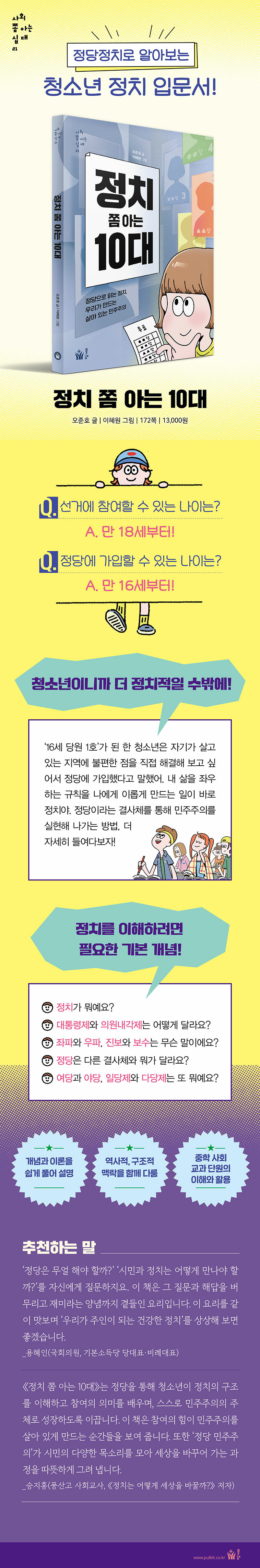 û¼Ò³âµéÀ» À§ÇÑ Á¤Ä¡ ±³¾ç Ã¥Àº ¸¹Áö¸¸, ÀÌ Ã¥Àº ¡®Á¤´çÁ¤Ä¡¡¯¶ó´Â ·»Á ÅëÇØ ¿ì¸® Á¤Ä¡¸¦ ´õ ±í°í ÀÚ¼¼È÷ µé¿©´Ùº»´Ù´Â Á¡ÀÌ °¡Àå Å« Â÷ÀÌÁ¡ÀÌÀÚ Æ¯Â¡ÀÌ´Ù. ƯÈ÷ ¡®±âº»¼Òµæ¡¯À» ¿ì¸® »çȸ¿¡ »Ñ¸®³»¸®±â À§ÇØ Á¤´ç Ȱµ¿À» ÇÑ ÀúÀÚ°¡ Çö½Ç Á¤Ä¡¿Í ¿¬°á½ÃÄÑ ¿ì¸® Á¤Ä¡ »óȲÀ» ¼³¸íÇØ ÁÖ°í ÀÖ¾î ¸Å¿ì À¯ÀÍÇÏ´Ù. ½Ã¹Îµé ´«¿¡´Â ¸Å¹ø Ä¡°í¹Þ´Â ½Î¿ò¸¸ ÀÏ»ï´Â Á¤Ä¡°¡ ¿Ö ±×·² ¼ö¹Û¿¡ ¾ø´ÂÁö ¿ª»çÀû, ±¸Á¶Àû ¸Æ¶ôÀ» Ç®¾î½á ÀÌÇØ°¡ ½±´Ù. ¶Ç, Ã¥ µÚ¿¡´Â Á¤Ä¡¸¦ ÀÌÇØÇÒ ¶§ ÇÔ²² º¸¸é ÁÁÀº Ã¥°ú ¿µ»óÀ» ¼Ò°³ÇØ ÀÌÇØ¸¦ µµ¿Ô´Ù. 2022³â °³Á¤ ±³°ú¼¿¡¼µµ ¡®¹ÎÁÖÁÖÀÇ¿Í ½Ã¹Î Âü¿©¡¯, ¡®Á¤Ä¡ °úÁ¤¡¯À» µÎ·ç ´Ù·ç°í ÀÖ¾î, ÀÌ Ã¥ÀÌ Ã»¼Ò³âµéÀÌ ¡®Á¤Ä¡¡¯¶ó´Â ¼¼°è¸¦ ¿©ÇàÇÏ´Â µ¥ ²À ÇÊ¿äÇÑ ÁöµµÀÌÀÚ ³ªÄ§¹Ý ¿ªÇÒÀ» ÇÒ °ÍÀÌ´Ù.
