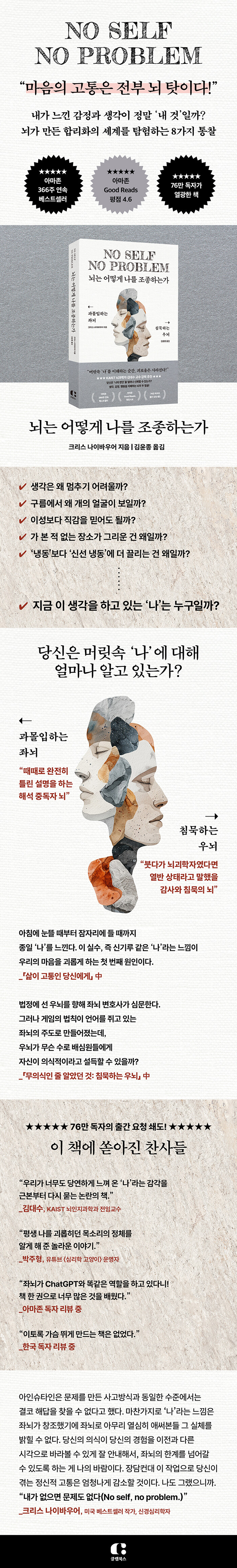 ¹Ì±¹ÀÇ º£½ºÆ®¼¿·¯ ÀÛ°¡ÀÌÀÚ ½Å°æ½É¸®ÇÐÀÚ Å©¸®½º ³ªÀ̹ٿì¾î ¹Ú»ç´Â 2500³â Àü ¼±ºÒ±³¿¡¼ ´Ù·ï ¿Â ¹«¾Æ(Ùíä²) »ç»óÀÌ Çö´ë ½Å°æ°úÇÐÀÇ ¼ö¸¹Àº ½ÇÇè °á°ú¿Í ³î¶ó¿ï Á¤µµ·Î À¯»çÇÏ´Ù´Â Á¡À» ¹ß°ßÇÑ´Ù. ½Å°æ½É¸®ÇÐÀڷμ 22³â°£ Á¿ì³úÀÇ ÀÛµ¿ ¿ø¸®¸¦ ¿¬±¸Çϰí, ¼öÇàÀڷμ µ¿¾çÀÇ ¿µÀû °¡¸£Ä§À» ¸ö¼Ò ½ÇõÇÑ ±×ÀÇ ½ÇÇèÀû Çຸ´Â Àǹ̸¦ °úÀ× »ý»êÇϰí ÀÚ½ÅÀÇ Á¸Àç °¡Ä¡¸¦ ÀǽÉÇÏ´Â Çö´ëÀε鿡°Ô ¿å¸ÁÀÇ µ¡¾øÀ½À» Àϱú¿ì´Â µ¿½Ã¿¡ ¡®³ª¡¯¸¦ ¹Ù¶óº¸´Â ½Å¼±ÇÑ °üÁ¡À» Á¦¾ÈÇÑ´Ù. ÇÙ½ÉÀº ´ÙÀ½°ú °°´Ù. µµ´ÞÇÒ ¼ö ¾ø´Â ¡®ÀÌ»óÀûÀÎ ³ª¡¯¸¦ ²÷ÀÓ¾øÀÌ °»½ÅÇÏ´Â Á³ú¿ÍÀÇ µ¿ÀϽø¦ ¸ØÃß°í °¨»ç¿Í ¿¬¹ÎÀ¸·Î °¡µæÇÑ ¿ì³ú ÀǽÄÀ» ±ú¿òÀ¸·Î½á »îÀÇ ±ÕÇüÀ» ¸ÂÃç °¡´Â °Í. Ãâ°£ Á÷ÈĺÎÅÍ ¾à 7³âÀÌ Áö³ Áö±Ý±îÁö ¾Æ¸¶Á¸ ½Å°æ½É¸®ÇÐ ºÐ¾ßÀÇ º£½ºÆ®¼¿·¯·Î ÀÚ¸®¸Å±èÇϸç Àü ¼¼°è µ¶ÀÚÀÇ ¡®Àλý Ã¥¡¯À¸·Î È£¸íµÇ°í ÀÖ´Ù.