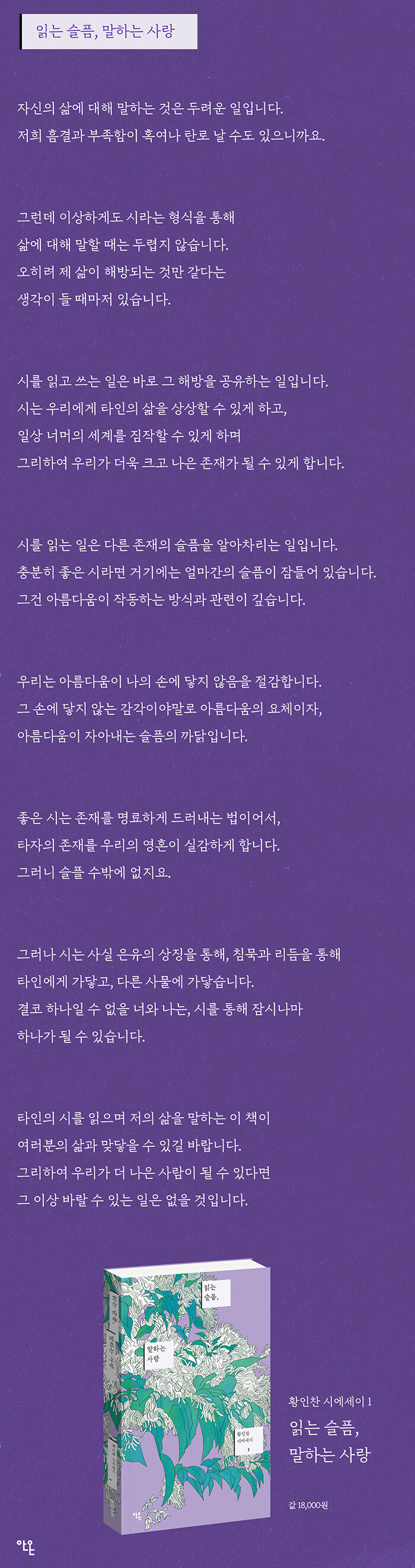 ȲÀÎÂù ½ÃÀÎÀÇ »ê¹®Áý ¡¶Àд ½½ÇÄ, ¸»ÇÏ´Â »ç¶û¡·ÀÌ »õ·Î¿î Ç¥Áö¿Í ÆÇÇüÀ¸·Î ´Ù½Ã Ãâ°£µÇ¾ú½À´Ï´Ù. ±è¼ö¿µ¹®Çлó, Çö´ë¹®Çлó µîÀ» ¼ö»óÇÏ¸ç µ¶ÀÚ¿Í Æò´ÜÀÇ »ç¶ûÀ» Æø³Ð°Ô ¹ÞÀº ȲÀÎÂù ½ÃÀÎÀÇ Ã¹ »ê¹®ÁýÀÎ ¡¶Àд ½½ÇÄ, ¸»ÇÏ´Â »ç¶û¡· Ãâ°£ 3³âÀ» ¸Â¾Æ ÂÄÂî ÀÛ°¡ÀÇ ±×¸²À¸·Î ±Ù»çÇÑ »õ ¿ÊÀ» ÀÔÀº °ÍÀÌÁö¿ä. ½ÃÀÎÀº ¹¯½À´Ï´Ù. ¹«¿ëÇÑ °Í Áß¿¡ °¡Àå ¹«¿ëÇÏ´Ù°í ¾Ë·ÁÁø ½Ã°¡, ¿ì¸®¿¡°Ô ²À ÇÊ¿äÇÑ »çÁ¤ÀÌ ¹«¾ùÀÎÁö. ±× ¹°À½¿¡ ½ÃÀÎ ¶ÇÇÑ ¼¼½ÉÇÑ Åµµ·Î ´äÇÕ´Ï´Ù. ¿ì¸®´Â ½Ã¸¦ ÀÐÀ½À¸·Î½á ¼ö¸¹Àº ½½ÇÄÀ» Çì¾Æ¸± ¼ö ÀÖ´Ù°í. ŸÀÎÀÇ ½½ÇÄÀ» ÁüÀÛÇÏ¸ç °Å±â¿¡¼ »ç¶ûÀ» ¹ß°ßÇÒ ¼ö ÀÖ´Ù°í. ÀÌó·³ ½Ã´Â ¿ì¸®¸¦ ÇÔ²² »ì°Ô ÇÕ´Ï´Ù. ±×°Ç ´õ ³ªÀº »îÀ̱⵵ ÇÒ °ÍÀÔ´Ï´Ù. ¡¶Àд ½½ÇÄ, ¸»ÇÏ´Â »ç¶û¡·Àº ½½Çİú »ç¶ûÀ̶ó´Â À̸§À¸·Î ½Ã°¡ ǰÀº ±â´É°ú ¿ªÇÒÀ» ´ÙÁ¤ÇÏ°Ô ¿ª¼³ÇÕ´Ï´Ù. ±×¸®ÇÏ¿© ÀÌ Ã¥Àº ȲÀÎÂù ½ÃÀÎÀÌ °¡Àå ºÎµå·¯¿î ¹æ¹ýÀ¸·Î °¡Àå ´Ü´ÜÇÏ°Ô ¾´ ½Ã Àб⠱³º»ÀÌ µÇ¾îÁÝ´Ï´Ù.