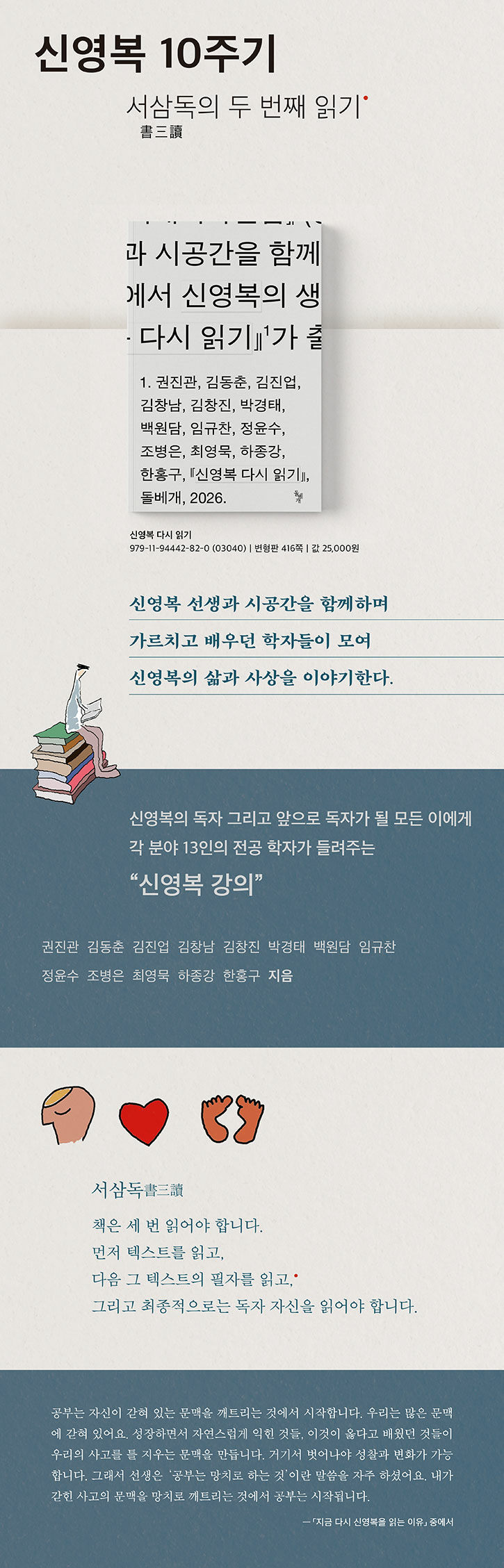 ¼±»ýÀÌ Áñ°Ü ¾²½Ã´ø ¼È °¡¿îµ¥ ¡´¼»ïµ¶¡µ(ßöß²ÔÁ)À̶õ ÀÛǰÀÌ ÀÖ´Ù. ¡®Ã¥Àº ¼¼ ¹ø Àоî¾ß ÇÑ´Ù, ¸ÕÀú ÅØ½ºÆ®¸¦ Àаí ÀúÀÚ¸¦ ÀÐ°í ±×¸®°í µ¶ÀÚ ÀÚ½ÅÀ» Àоî¾ß ÇÑ´Ù¡¯´Â, ¼¼ °¡Áö Â÷¿øÀÇ µ¶¼¸¦ À̾߱âÇÑ ¸»ÀÌ´Ù. Áï, Ã¥À» ÀÐµÇ ÅØ½ºÆ® ÀÚü¿¡ ¾ô¸ÅÀÌÁö ¾Ê°í Ã¥ÀÌ Ã³ÇÑ ¿ª»çÀû ¸Æ¶ôÀ» »ìÇÇ¸ç µ¶ÀÚ ½º½º·Î »çÀ¯ÇØ¾ß ÇÑ´Ù´Â ÀǹÌÀÌ´Ù. ±×·¸±â¿¡ ¼±»ýÀÇ ¸»¾¸Ã³·³ ¡°ÇÊÀÚ´Â Á×°í µ¶ÀÚ´Â ²÷ÀÓ¾øÀÌ Åº»ý¡±ÇÏ´Â °ÍÀÌ´Ù. ¼±»ýÀÇ Àú¼µéÀ» Àд °ÍÀÌ ¼»ïµ¶ÀÇ Ã¹ ¹øÂ° Àбâ¶ó¸é, ÀÌ Ã¥ ¡º½Å¿µº¹ ´Ù½Ã Àб⡻´Â ¿¼¼ ¸íÀÇ ÀúÀÚµéÀÌ ÀúÀÚ ½Å¿µº¹À» ÀÐ¾î ³½ ¼»ïµ¶ÀÇ µÎ ¹øÂ° Àбâ¶ó°í ÇÒ ¼ö ÀÖ´Ù.