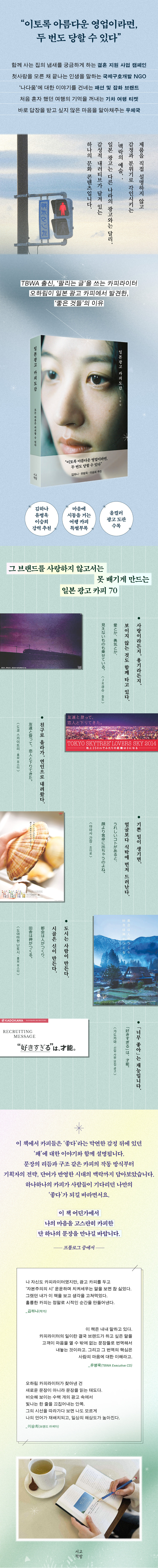ÀúÀÚ°¡ ¾ÖÁ¤À» µë»Ò ´ã¾Æ ¾ö¼±ÇÑ 70°³ÀÇ ÀϺ» ±¤°í Ä«ÇÇ´Â ´Ü¼øÈ÷ ÆÇ¸Å¸¦ ÃËÁøÇÏ´Â ¹®Àå¿¡ ±×Ä¡Áö ¾Ê´Â´Ù. ÇÔ²² »ç´Â ÁýÀÇ ³¿»õ¸¦ ±Ã±ÝÇÏ°Ô ÇÏ´Â °áÈ¥ Áö¿ø »ç¾÷ Ä·ÆäÀÎ, ù»ç¶ûÀ» ¸ð¸¥ ä ³¡³ª´Â ÀλýÀ» ¸»ÇÏ´Â ±¹Á¦±¸È£°³¹ß NGO, ¡®³ª´Ù¿ò¡¯¿¡ ´ëÇÑ À̾߱⸦ °Ç³×´Â ÆÐ¼Ç ¹× ÀâÈ ºê·£µå, óÀ½ È¥ÀÚ Çß´ø ¿©ÇàÀÇ ±â¾ïÀ» ²¨³»´Â ±âÂ÷ ¿©Çà Æ¼ÄÏ, ¹Ù·Î ´äÀåÀ» ¹Þ°í ½ÍÁö ¾ÊÀº ¸¶À½À» ¾Ë¾ÆÃ¤´Â ¿ìü±¹±îÁö. ÀϺ» ±â¾÷°ú ºê·£µå¿¡¼ ÆîÃÄ º¸ÀÌ´Â ÀÌ ¹®ÀåµéÀº Æò¹üÇÑ Àϻ󿡼 ¿ì¸®°¡ ³õÄ¡°í Áö³ªÃÆ´ø °¨Á¤°ú Àǹ̸¦ ¤¾î³»¸é¼ ¾î¶² ½Ã°¢À¸·Î ¹Ù¶óº¸°í, ¾î¶² ´Ü¾î¸¦ ¼±ÅÃÇÏ´À³Ä¿¡ µû¶ó ÀüÇô ´Ù¸¥ ¼¼°è°¡ ÆîÃÄÁø´Ù´Â °ÍÀ» ¼¶¼¼ÇÏ°Ô º¸¿©ÁØ´Ù. ¸¶Ä¡ ÇÑ ÆíÀÇ ½Ã¸¦ °¨»óÇϵí ªÀº Ä«ÇÇ ÇÑ ÁÙ ¼Ó¿¡ ´ã±ä ¿©·¯ °ãÀÇ À̾߱⸦ ¹ß°ßÇÏ´Â Àç¹Ì¸¦ ¹ß°ßÇÏ°Ô µÉ °ÍÀÌ´Ù.