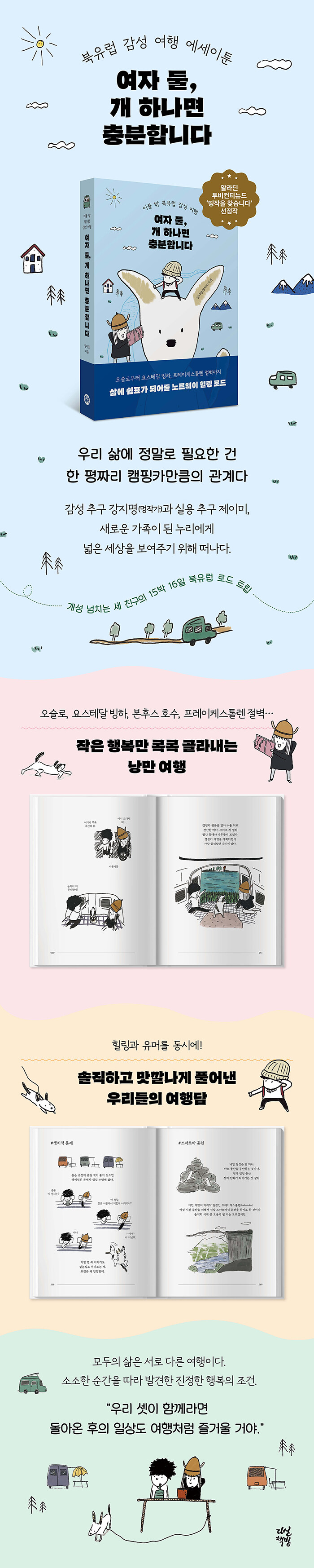 ¾î¼¸é ¡®¿Ïº®ÇÑ ¿©Ç࡯À̶ó°í Çϱ⿡´Â ´Ù¼Ò º¸À߰;ø°í ¾î¼³Ç ¿©Á¤ÀÌ´Ù. ºó Ä·ÇÎÀåÀ» ã¾Æ ÇÑÂü °í»ýÇÑ ³¯ÀÇ Æ¯½ÄÀº ¡®½ºÆÔ¡¯À̰í, ÁüÀ» È¥ÀÚ¼¸¸ ¿Å±â´Ù°¡ ±âºÐÀÌ »óÇÏ´Â Àϵµ ÀÖ°í, Ä·ÇÎÀåÀÌ ¾Æ´Ñ °÷¿¡¼ ¹¬´Â ¡®ÇÁ¸®Ä·ÇΡ¯À» ÇÏ´Ù°¡ °ü¸®Àο¡°Ô ÂѰܳª±âµµ ÇÑ´Ù. È·ÁÇÑ ¼÷¼Ò³ª °í±Þ½º·¯¿î À½½ÄÀº ¾ø°í ½Ç¼öµµ ¸¹Àº ¿©ÇàÀÌÁö¸¸, ÀÛ°¡´Â Å©°í ÀÛÀº ÇØÇÁ´×À» ¿¹»Ú°Ô Æ÷ÀåÇÏÁö ¾Ê´Â´Ù. ¿ÀÈ÷·Á ¿Ïº®ÇÏÁö ¾Ê¾Ò±â¿¡ ´õ ¸¹ÀÌ ¿ôÀ» ¼ö ÀÖ¾ú´Ù°í ¸»ÇÏµí ¼ÖÁ÷Çϰí À¯¸Ó·¯½ºÇÏ°Ô Ç®¾î º¸ÀδÙ. ÀÌ Ã¥À» Àд »ç¶÷ÀÌ ¿©À¯¿Í Æí¾ÈÇÔ»Ó ¾Æ´Ï¶ó Àç¹Ì¿Í ¿ôÀ½±îÁö ¸¸³£ÇÒ ¼ö ÀÖ´Â °ÍÀº, ¼¼ Ä£±¸ÀÇ ¿©ÇàÀÌ ÀÌ·¸°Ô³ª ¾û¼ºÇÏ°í ´ÙÁ¤ÇÑ ¸Å·ÂÀ» °¡Áö°í Àֱ⠶§¹®ÀÏ °ÍÀÌ´Ù.