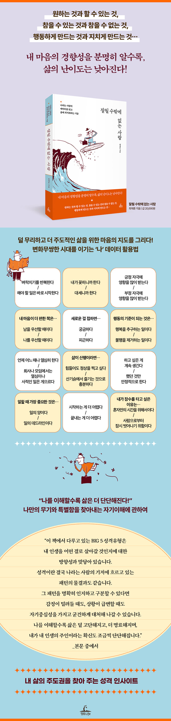 ÀÌ·¸°Ô ³ª¸¦ ÀÌÇØÇÒ¼ö·Ï »îÀº ´ú °í´ÜÇØÁö°í, ´õ ¸í·áÇØÁö¸ç, ³»°¡ ³» ÀλýÀÇ ÁÖÀÎÀ̶ó´Â È®½Åµµ Á¶±Ý¾¿ ´Ü´ÜÇØÁø´Ù. ÀÌ Ã¥Àº ¿ì¸®¸¦ ±¸¼ºÇϰí ÀÖ´Â ´Ù¼¸ °¡Áö ¼º°Ý ¿äÀΰú ±× Á¶ÇÕ¿¡ ´ëÇØ °ø°¨ °¡´Â »ç·Ê¸¦ ÅëÇØ ÀÚ¼¼È÷ ¼Ò°³ÇÑ´Ù. ¶ÇÇÑ ¼º°ÝÀÌ ¶óÀÌÇÁ½ºÅ¸ÀÏ, Àΰ£°ü°è, Ä¿¸®¾î, Çູ¿¡ °¢°¢ ¾î¶°ÇÑ ¿µÇâÀ» ¹ÌÄ¥ ¼ö ÀÖ´ÂÁö Ž»öÇϰí À̸¦ ¿ì¸® »î¿¡ ÀÌ·Ó°Ô Àû¿ëÇÒ ¼ö ÀÖ´Â °£´ÜÇÑ ½Çõ ¹æ¹ý±îÁö ¾Æ¿ï·¯ Á¦°øÇÏ¿©, ´©±¸³ª ³ª¸¸ÀÇ Æ¯º°ÇÔ°ú °Á¡À» ã¾Æ³¾ ¼ö ÀÖµµ·Ï µ½´Â´Ù.