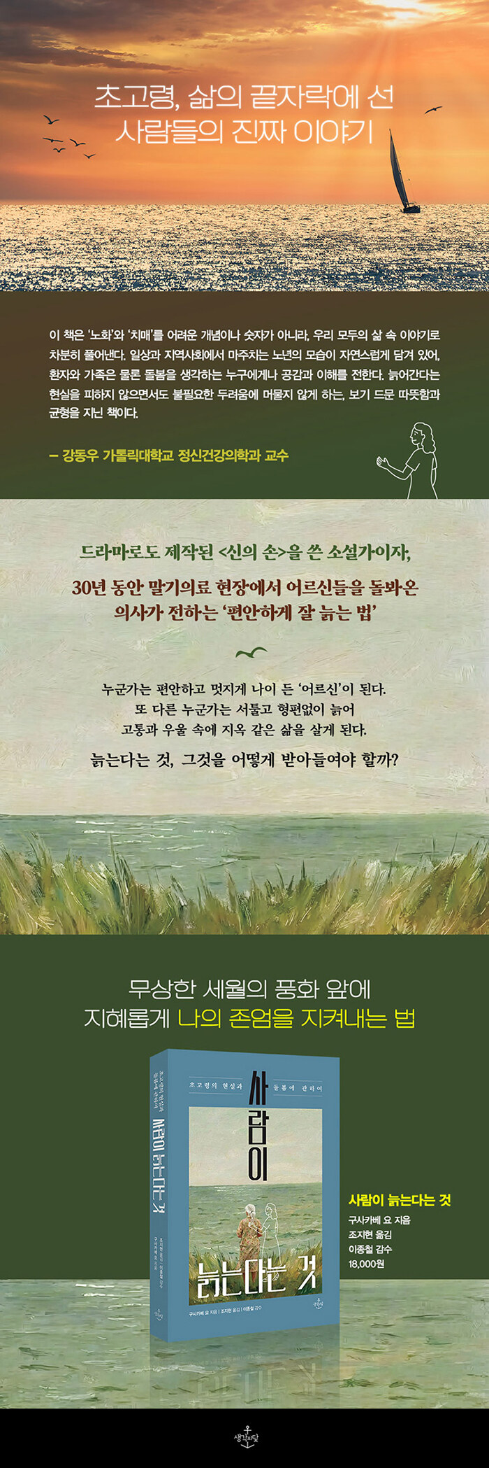 ÀÌ Ã¥ÀÇ ÀúÀÚ ±¸»çÄ«º£ ¿ä´Â ¼Ò¼³°¡·Î ³Î¸® ¾Ë·ÁÁ® ÀÖÁö¸¸, ÀϺ» ¿À»çÄ« Áö¿ª µ¥ÀÌÄɾÅÍ Å¬¸®´Ð¿¡¼ Ãʰí·É ³ëÀÎÀ» 30³â °¡±îÀÌ µ¹ºÁ¿Â ÀÇ»ç´Ù. ÀúÀÚ´Â Ãʰí·ÉÀÇ ³ëÀεéÀ» Áø·áÇÏ¸é¼ ´©±º°¡´Â Æí¾ÈÇÏ°í ¸ÚÁö°Ô ³ªÀÌ µç ¡®¾î¸£½Å¡¯ÀÌ µÇ´Âµ¥, ´©±º°¡´Â ¼Åø°í ÇüÆí¾øÀÌ ´Ä¾î¹ö·Á °íÅë°ú ¿ì¿ï ¼Ó¿¡ Áö¿Á °°Àº »îÀ» »ì¾Æ°¡´Â ¸ð½ÀÀ» ¹ß°ßÇÑ´Ù. ±×¸®°í µÑ »çÀÌ¿¡ ¾î¶² Â÷ÀÌÁ¡ÀÌ ÀÖ´ÂÁö ±Ã±ÝÇØÁ³´Ù. ÀÌÈÄ ÀÇ·á ÇöÀå¿¡¼ ³ëÀεé°ú Á÷Á¢ ¸¸³ª¸é¼ ¡®»ç¶÷ÀÌ ´Ä´Â´Ù´Â °Í¡¯ÀÌ ¹«¾ùÀÎÁö Áý¿äÇÏ°Ô ÆÄ°í µé¾ú´Ù. ¡¶»ç¶÷ÀÌ ´Ä´Â´Ù´Â °Í¡·Àº ¿ì¸®º¸´Ù ¸ÕÀú Ãʰí·ÉÀ» °æÇèÇÑ ÀϺ»¿¡¼ ÀÇ»ç·Î ÀÏÇØ¿Â ÀúÀÚ°¡ Á÷Á¢ °í·ÉÀÇ ³ëÀεé°ú ¸¸³ª °æÇèÇÏ°í µé¾ú´ø ¿©·¯ °¡Áö »ý°¢À» ´ã°í ÀÖ´Ù. ¡®´Ä´Â´Ù´Â °ÍÀº ¹«¾ùÀ̰í, ³ª´Â ¾î¶»°Ô ´Ä¾î°¥ °ÍÀΰ¡¡¯ ÇÏ´Â °í¹ÎÀÌ ´ã±ä Ã¥ÀÌ´Ù.