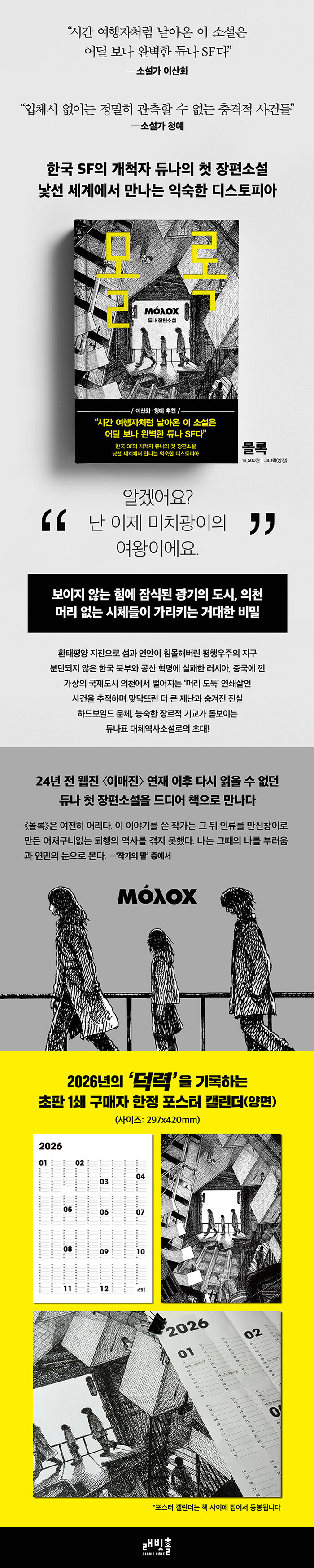 °¢±â ´Ù¸¥ »óȲ¿¡ óÇÑ ¼¼ ¿©¼º Àι°ÀÇ ÀÔÀå°ú ½Ã¼±ÀÌ ±³Â÷µÇ¸ç ÀÇõÀ̶ó´Â µµ½Ã°¡ ÀÔüÀûÀ¸·Î »ì¾Æ³ª ¸Å·ÂÀ» ´õÇÑ´Ù. À̵éÀº ¸Ó¸®°¡ ¾ø´Ù´Â °ÍÀ» Á¦¿ÜÇϰí´Â µµÅë °øÅëÁ¡À» ãÀ» ¼ö ¾ø´Â ¿¬¼â»ìÀÎ »ç°ÇÀÇ ¼Ò¿ëµ¹ÀÌ ¾È¿¡¼ ¼ûÀº Áø½Ç¿¡ Â÷Ãû Á¢±ÙÇÏ°Ô µÈ´Ù. °í´ë °¡³ª¾È Áö¹æ¿¡¼ »ç¶÷À» Á¦¹°·Î ¹Þ¾Ò´Ù´Â ½Å ¡®¸ô·Ï(¥Ì£¿¥ë¥ï¥ö, Moloch)¡¯Àº ¼Ò¼³¿¡¼ Á÷Á¢ÀûÀ¸·Î ¾ð±ÞµÇÁö ¾ÊÁö¸¸, ÀÌ ¾È¿¡¼ ÀϾ´Â »ìÀΰú ¸¶¾à, Á¤½Å Á¶Á¾À» µÑ·¯½Ñ ¹Ì½ºÅ͸®¸¦ °üÅëÇÏ´Â ´Ü¾îÀÌ´Ù. µà³ª ƯÀ¯ÀÇ ±¤ÆøÇÑ ¼»ç Àü°³°¡ ´«ÀÌ ÇÎÇÎ µ¹¾Æ°¡´Â Àç¹Ì¸¦ ¼±»çÇÏ´Â µ¿½Ã¿¡, ´Ù¹®È ȯ°æ ¼Ó¿¡¼ ¹ß»ýÇÏ´Â ÀÎÁ¾Â÷º°°ú ¿Ü±¹ÀÎ Çø¿ÀÀÇ ±ØÀû ÀçÇöÀ» ÅëÇØ Áö±Ý ¿ì¸® ¼¼°è¿¡ Àý½ÇÇÏ°Ô ÇÊ¿äÇß´ø Áú¹®µéÀ» ³¯Ä«·Ó°Ô ´øÁö´Â ÀÛǰ ¡¶¸ô·Ï¡·. 24³â°£ ±â´Ù·Á¿Â µà³ªÀÇ ¿À·£ ÆÒÀº ¹°·Ð Çϵ庸ÀϵåÇÑ SF ¹Ì½ºÅ͸®¸¦ Áñ±æ Áغñ°¡ µÈ ¸ðµç µ¶ÀÚ¸¦ ¸¸Á·½Ãų ¼Ò¼³ÀÌ´Ù.