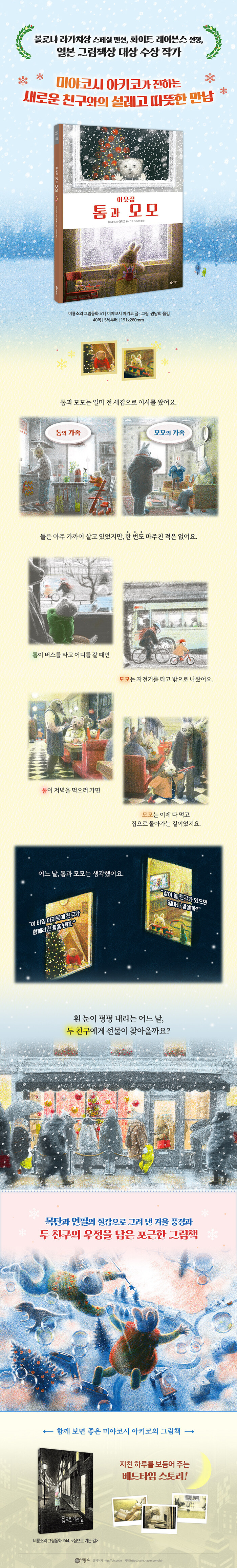 ¼±¹°Ã³·³ ã¾Æ¿Â Ä£±¸¿Í º¸³»´Â µû¶æÇÑ ¿¬¸»À» ±×¸° ¡ºÀÌ¿ôÁý Åè°ú ¸ð¸ð¡»°¡ ¢ßºñ·æ¼Ò¿¡¼ Ãâ°£µÇ¾ú´Ù. ¾î´À ³¯ Åè°ú ¸ð¸ð´Â »õÁýÀ¸·Î À̻縦 ÇÑ´Ù. µÎ °¡Á·Àº ¾ÆÁÖ °¡±îÀÌ »ì°í ÀÖÁö¸¸ °çÀ» ½ºÃÄ Áö³ª°¡±â¸¸ ÇÒ »Ó ¸¸³ªÁö ¸øÇÑ´Ù. ±×·¯´ø Å©¸®½º¸¶½ºÀ̺ê, ¾ö¸¶¿Í ÇÔ²² Å©¸®½º¸¶½º ÄÉÀÌÅ©¸¦ »ç·¯ °£ Åè°ú ¸ð¸ð´Â ¼·Î¸¦ º¸°Ô µÈ´Ù. ¿ì¿¬ÀÌ ½×¿© Ä£±¸°¡ µÇ´Â Åè°ú ¸ð¸ðÀÇ µû¶æÇÑ ¸¸³²À» ±×·Á ³½ ±×¸²Ã¥ÀÌ´Ù.