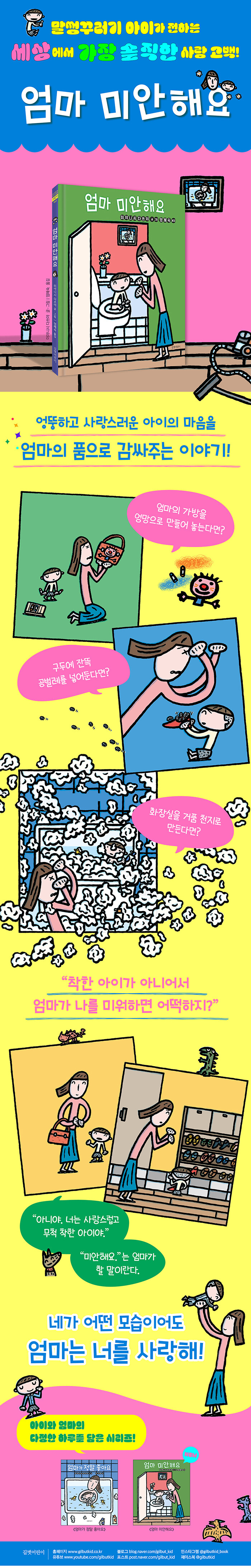 ¡¶¾ö¸¶ ¹Ì¾ÈÇØ¿ä¡·´Â ¡¶¾ö¸¶°¡ Á¤¸» ÁÁ¾Æ¿ä¡·ÀÇ ÈļÓÀÛÀ¸·Î, ¹Ì¾ß´Ï½Ã ´Ù¾²¾ß ƯÀ¯ÀÇ ´Ü¼øÇÏ°í °·ÄÇÑ ±×¸²°ú °£°áÇÑ ±Û·Î ¸»½é²Ù·¯±âÀÌÁö¸¸ ¿©ÀüÈ÷ »ç¶û½º·¯¿î ¾ÆÀÌÀÇ ¸ð½À°ú ±×·± ¾ÆÀ̸¦ ǰ¾î ÁÖ´Â ¾ö¸¶ ¸¶À½À» µûµíÇÏ°Ô ±×·Á³½ ±×¸²Ã¥ÀÔ´Ï´Ù. ¾ÆÀÌÀÇ Áø½É ¾î¸° »ç°ú¿Í, ¸ÅÀÏ ¹ã Àáµç ¾ÆÀÌÀÇ ¾ó±¼À» º¸¸ç ¡°¹Ì¾ÈÇØ¡±¶ó°í ¼Ó»èÀÌ´Â ¾ö¸¶ÀÇ °í¹éÀ» ÅëÇØ ºÎ¸ð¿Í ¾ÆÀ̰¡ ¼·ÎÀÇ ¸¶À½À» ÀÌÇØÇϰí, »ç¶û°ú ¿ë¼¸¦ ³ª´©´Â °¡Á·ÀÇ Áø½ÉÀ» »ç¶û½º·± ±×¸²°ú ÇÔ²² ±×·Á³À´Ï´Ù.