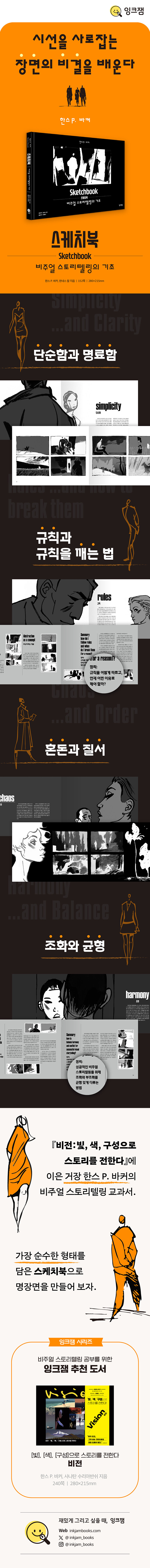 ÀÌ Ã¥Àº ³× ºÎºÐÀ¸·Î ±¸¼ºµÇ¾î ¡®´Ü¼øÇÔ°ú ¸í·áÇÔ¡¯, ¡®±ÔÄ¢°ú ±ÔÄ¢À» ±ú¶ß¸®´Â ¹ý¡¯, ¡®È¥µ·°ú Áú¼¡¯, ¡®Á¶È¿Í ±ÕÇü¡¯ °°Àº ¿ø¸®¸¦ Â÷·Ê·Î Ç®¾î³½´Ù. Ã¥¿¡ ´ã±ä Èæ¹é ½ºÄÉÄ¡´Â ÀýÁ¦µÈ Ç¥Çö¸¸À¸·Î ÀüÇÏ°í ½ÍÀº ¸Þ½ÃÁö¸¦ ¼±¸íÇÏ°Ô µå·¯³»¸é¼µµ, ÇÑ Àå ÇÑ ÀåÀÌ ¿Ï°áµÈ ÀÛǰó·³ ¿Ï¼ºµµ¸¦ Áö³æ´Ù. ¼ö¹é Á¡ÀÇ µå·ÎÀ×°ú °£°áÇÑ ÇØ¼³À» ÅëÇØ ¹Ý¼¼±â µ¿¾È ÇöÀå¿¡¼ ÃàÀûÇÑ °ÅÀåÀÇ ÆÇ´Ü ±âÁذú âÀÛ ¹æ½ÄÀ» ÀÚ¿¬½º·´°Ô üµæÇÏ°Ô µÈ´Ù. Ã¥ÀåÀ» ³Ñ±â´Â °Í¸¸À¸·Î ¶Ç·ÇÇÑ Àǵµ°¡ µå·¯³ª´Â Àå¸éÀ» È¿À²ÀûÀ¸·Î ¼³°èÇϰí, ÄܼÁÆ®¿Í ½ºÅ丮¸¦ ´ã¾Æ ȸéÀÇ »À´ë¸¦ ¼¼¿ì´Â ¹ýÀ» ±¸Ã¼ÀûÀ¸·Î ÀÍÈú ¼ö ÀÖ´Ù. ÀÌ Ã¥Àº ´Ü¼øÈ÷ ±×¸²À» Àß ±×¸®´Â ±â¼úÀ» ³Ñ¾î, ¾î´À ¸Åü¿¡³ª Àû¿ëÇÒ ¼ö ÀÖ´Â ºñÁÖ¾ó ½ºÅ丮ÅÚ¸µÀÇ ¿øÄ¢À» ¼¼¿ì°í ½ÍÀº âÀÛÀڵ鿡°Ô °ß°íÇÑ Åä´ë°¡ µÇ¾î ÁÙ °ÍÀÌ´Ù.