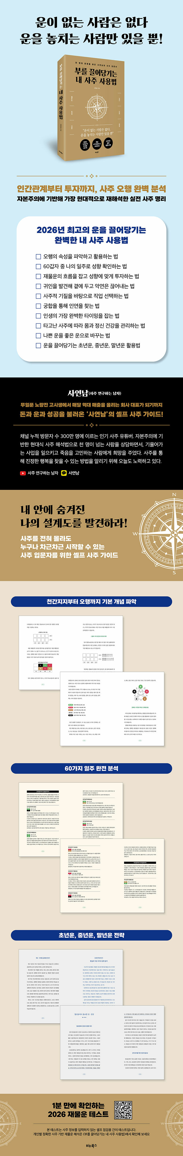 »ç¿¬³²ÀÇ °¡À̵忡 µû¶ó õ°£ÁöÁöÀÇ ±âº» °³³äÀ» ÆÄ¾ÇÇÏ°í ¿ÀÇàÀÇ ¿ø¸®¸¦ ÀÍÈ÷¸é º¹ÀâÇØ º¸¿´´ø »çÁÖÆÈÀÚ ±ÛÀÚÀÇ »ö±ò°ú ÇÑÀÚ¸¦ ÈÍÈ÷ ²ç¶Õ¾î º¼ ¼ö ÀÖ°Ô µÈ´Ù. ÀÌ ¿©´ü ±ÛÀÚ°¡ ³ª ÀÚ½ÅÀÇ ¼ºÇâÀº ¹°·ÐÀÌ°í ºÎ¸ð³ª ÀڽİúÀÇ °ü°è, Ãʳâ¿îºÎÅÍ ¸»³â¿î±îÁöÀÇ Àλý ¿©Á¤À» ÇÑ´«¿¡ »ìÆìº¼ ¼ö ÀÖ´Â ÁöµµÀÌÀÚ ³ªÄ§¹ÝÀÎ °ÍÀÌ´Ù. ¿©±â±îÁö È®ÀÎÇÏ°í ³ª¸é ÀÌÁ¨ »çÁÖ¸¦ ¾î¶»°Ô Ȱ¿ëÇÒÁö Àû¿ëÇÏ´Â ¹æ¹ýÀ» ¹è¿ï ¼ö ÀÖ´Ù. ÀÚ½ÅÀÇ »çÁÖ¿¡ ¸Â°Ô Àç¹°¿îÀÇ È帧À» Àâ°í ¼ºÇâ¿¡ µû¶ó ÅõÀÚÇÏ´Â ¹ý, »çÁÖÀû ±âÁúÀ» ¹ÙÅÁÀ¸·Î Á÷¾÷À» ¼±ÅÃÇÏ´Â ¹ý, ¼º°øÀ» °ÅµÎ´Â µ¥ ÇʼöÀû ¿äÀÎÀÎ ¡®±ÍÀΡ¯À» ¹ß°ßÇØ °ç¿¡ µÎ°í ¾Ç¿¬Àº ²÷¾î³»´Â ¹ý, ÁýÀ» »ç°íÆÄ´Â ½Ã±â¸¦ ¾Æ´Â ¹ý, ÀλýÀÇ °¡Àå ¿Ïº®ÇÑ Å¸À̹ÖÀ» Àâ´Â ¹ý ±×¸®°í ±ÃÇÕÀ» ÅëÇØ Àο¬À» Àâ´Â ¹ý°ú ¸ö°ú Á¤½ÅÀ» °ü¸®ÇÏ´Â ¹ý±îÁö, ¿îÀ» ²ø¾î´ç°Ü ¼º°øÀ» °ÅµÑ ¼ö ÀÖ´Â ¸ðµç ºñ¹ÐÀ» ³¹³¹ÀÌ °ø°³ÇÑ´Ù.