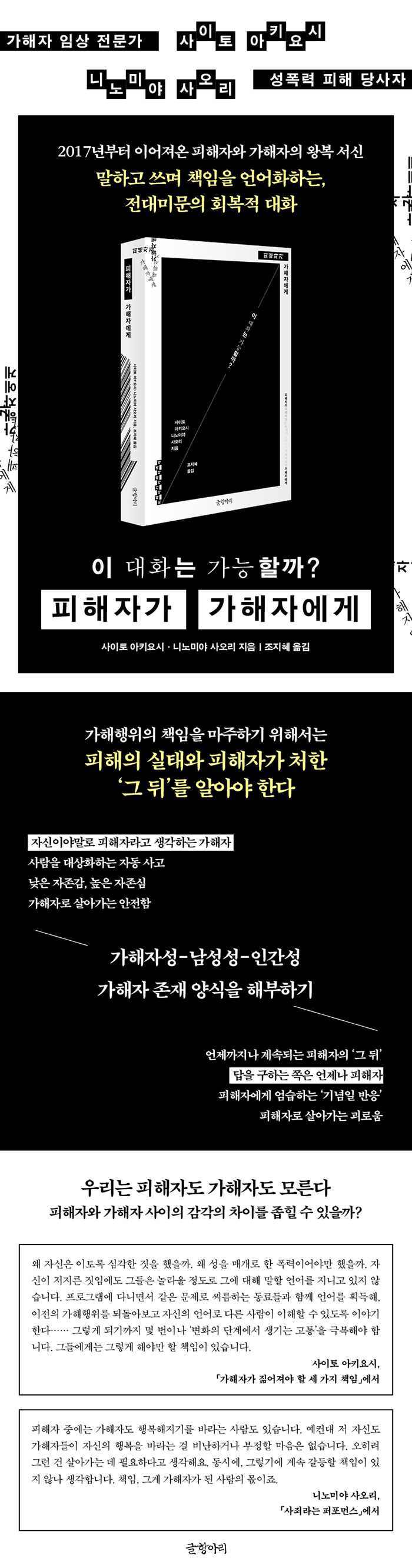 ´äÀ» ±¸ÇÏ´Â ÂÊÀº ¾ðÁ¦³ª ÇÇÇØÀÚ´Ù. ¼ºÆø·Â ÇÇÇØ ´ç»çÀÚÀÎ ´Ï³ë¹Ì¾ß »ç¿À¸®´Â ¿À·§µ¿¾È Áú¹®ÇؿԴÙ. ¡®¿Ö ³ª¿´À»±î?¡¯ ¡®³ª¿©¾ß¸¸ Çß´ø °É±î?¡¯ »çȸ°¡ ÀÌ·¸°Ô Ʋ Áö¾îÁ³±â ¶§¹®ÀÌ´Ù. ¡®ÂªÀº ¿ÊÀ» ÀÔ¾ú¾î?¡¯ ¡®¿©Áö¸¦ ÁØ °Ç ¾Æ´Ï¾ß?¡¯ ±×·¯³ª ±×³à ¾È¿¡¼ ´äÀ» ã±â¶õ ºÒ°¡´ÉÇÏ´Ù. ÀÌ Áú¹®¿¡´Â ÇÇÇØÀÚ°¡ ¾Æ´Ñ °¡ÇØÀÚ°¡ ´äÇØ¾ß ÇÑ´Ù. ÀÌ Ã¥Àº ¹Ù·Î ÀÌ·± Áø½Ç À§¿¡ ¼ ÀÖ´Ù. ÇÇÇØÀÚ¿Í °¡ÇØÀÚÀÇ ´ëȸ¦ ½ÃÀÛÇϱ⿡ ¾Õ¼, À̵éÀÌ °Þ´Â »ç°Ç ¡®±× µÚ¡¯ÀÇ ½Ã°£ÀÌ °áÄÚ °°À» ¼ö ¾ø´Ù´Â Áø½Ç. ±×·¯¹Ç·Î ÀÌ ´ëÈ´Â ½ÃÀÛµµ Àü¿¡ ¼ö¾ø´Â ½ÇÆÐ¸¦ ÀüÁ¦ÇÑ´Ù. °¡ÇØÀÚ°¡ ÇÇÇØÀÚ¸¦ ¸ð¸£µíÀÌ ÇÇÇØÀÚ ¿ª½Ã °¡ÇØÀÚ¸¦ ¾ËÁö ¸øÇϸç, ¿ì¸® ¶ÇÇÑ °¡ÇØÀÚ¿Í ÇÇÇØÀÚ ¸ðµÎ ¾ËÁö ¸øÇÑ´Ù. ´Ï³ë¹Ì¾ß´Â ±×³à°¡ ǰ¾î¿Â Áú¹®¿¡ ½ÇÁ¦ ¼ºÆø·Â °¡Çظ¦ ÇÑ »ç¶÷ÀÌ ´äÇÑ´Ù¸é ºñ·Î¼Ò ±«·Î¿î Àǹ®ÀÇ ¼Ò¿ëµ¹À̷κÎÅÍ ¹þ¾î³¯ ¼ö ÀÖÀ¸¸®¶ó »ý°¢Çß´Ù. ±× °°Àº °á´Ü¿¡ ÈûÀÔ¾î ÇÇÇØÀÚ¿Í °¡ÇØÀÚ °£ÀÇ Àü´ë¹Ì¹®ÀÇ ´ëȰ¡ ½ÃÀ۵ȴÙ. ±×³à°¡ °¨ÇàÇϱâ·Î ÇÑ °ÍÀº °¡ÇØÀÚ¿¡°Ô È®¼º±â¸¦ Áã¿©Áشٰųª ±×µéÀÇ È£¼Ò¸¦ °¨¾ÈÇØº¸ÀÚ´Â ½ÄÀÇ °¨Á¤Àû ¹è·Á¿Í´Â ¹«°üÇÏ´Ù. ±×º¸´Ù ¿ÀÈ÷·Á ´©±¸³ª ÇÇÇØÀÚ-°¡ÇØÀÚ°¡ µÉ ¼ö ÀÖ´Ù´Â »ç½ÇÀ» ³ÃÁ¤È÷ ¹Þ¾ÆµéÀÓÀ¸·Î½á ÇÇÇØ-°¡Çضó´Â µµ½Ä°ú Áõ¿ÀÀÇ °í¸®¸¦ ²÷¾î³»°Ú´Ù´Â °á±âÀÌ´Ù.