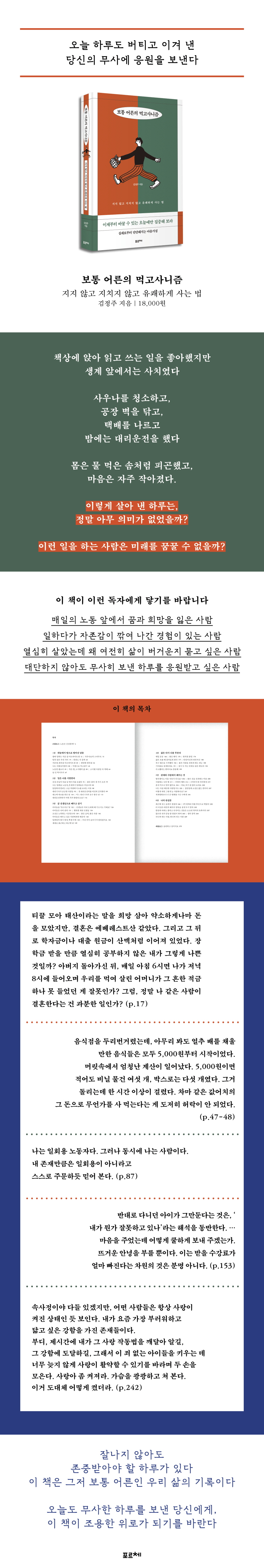 °áÈ¥°ú µ¶¸³, Ãâ»ê ÀÌÈÄÀÇ ¾çÀ°±îÁö »îÀÇ Ã¥ÀÓÀÌ ´Ã¾î³¯¼ö·Ï °¡ÀåÀÇ ¼±ÅÃÁö´Â ÁÙ¾îµé°í, ³ëµ¿ÀÇ °µµ´Â ³ô¾ÆÁø´Ù. ÀúÀÚ´Â °¡Á·À» Áö۱â À§ÇØ °¨´çÇØ¾ß Çß´ø ºÒ¾È°ú ÃʶóÇÔ, ±×¸®°í ¹Ýº¹µÇ´Â Àڱ⠰˿ÀÇ ½Ã°£À» ¼ÖÁ÷ÇÏ°Ô µå·¯³Â´Ù. ±×¸®°í °íµÈ ³ëµ¿ÀÇ ³¡¿¡¼ ±Û·Î½á ÀÚ½ÅÀ» ´Ù½Ã ÀÏÀ¸ÄÑ ¼¼¿î´Ù. ±×°ÍÀÌ ÀÌ Ã¥ÀÌ ¸»ÇÏ´Â º¸Åë ¾î¸¥ÀÇ ¸Ô°í»ç´ÏÁòÀÌ´Ù. ¿ì¸® ÁÖº¯¿¡´Â ¼º°øÇÑ »ç¶÷µéÀÌ Âü ¸¹´Ù. ºÎÀÚµµ ¸¹°í ³ªº¸´Ù Àß»ç´Â »ç¶÷À¸·Î °¡µæÇؼ ³» »îÀº ¾Æ¹«°Íµµ ¾Æ´Ñ °Íó·³ ´À²¸Áú ¼öµµ ÀÖ´Ù. ±×·¯³ª µ·°ú ºÎ¿Í ¸í¿¹°¡ ¾ø´Ù°í ÇØ¼ Àǹ̰¡ »ç¶óÁö´Â °ÍÀº ¾Æ´Ï´Ù. »ý°è¸¦ Ã¥ÀÓÁö¸ç °í´ÜÇÑ ÇÏ·çÇϷ縦 ÀÌ°Ü ³»´Â »ç¶÷ÀÇ À̾߱⿡´Â ´«±æÀÌ ¸Ó¹®´Ù. ±×·¯¹Ç·Î ´ç½ÅÀÌ ¹öÅß ³½ ÇÏ·ç´Â Àý´ë ÃʶóÇÏÁö ¾Ê´Ù. ÀÏÇÏ´Â ¿ì¸® ¸ðµÎÀÇ ÇÏ·ç°¡ ±× ÀÚü·Î ÃæºÐÈ÷ ´ë´ÜÇϰí Á¸Áß¹Þ¾Æ¾ß ÇÏ´Â ÀÌÀ¯ÀÌ´Ù. ¹öƼ´Â »îÀ» »ç´Â »ç¶÷¿¡°Ô ÇÊ¿äÇÑ °ÍÀº °Ý·Áº¸´Ù ÀÌÇØÀÏÁöµµ ¸ð¸¥´Ù. ÀÌ Ã¥Àº ¹Ù·Î ±× ÀÌÇØ¸¦ ¾ð¾î·Î ¿Å±ä ±â·ÏÀÌÀÚ µ¿·áÀÇ ¾ð¾î´Ù. ¸·¸·Çϰí Èûµç ½Ã±â¸¦ °°Àº ÀÚ¸®¿¡¼ ¹öÅß º» »ç¶÷¸¸ÀÌ ¾µ ¼ö ÀÖ´Â ¹®ÀåÀÌ´Ù. Àý¸Á¸¸ Çϱ⿡´Â ¾Æ±î¿î ³¯ÀÌ´Ù. »ì¾Æ¿Â ¸¸Å ÇູÀ» ½×¾Æ°¡±â¸¦ ¹Ù¶ó´Â ¸¶À½À¸·Î ÀÀ¿øÀ» º¸³½´Ù.