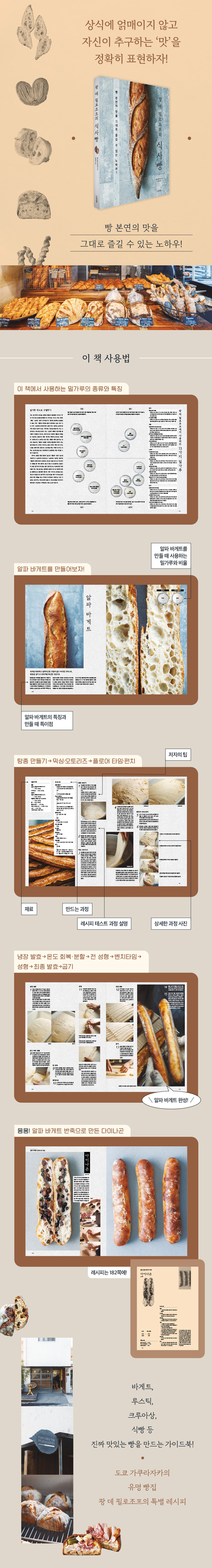 ½Ä»§, ¹Ù°ÔÆ®, ·ç½ºÆ½ µîÀÇ ½Ä»ç»§¿¡ ¹¹ Ưº°ÇÑ °ÍÀÌ ÀÖÀ»±î ½ÍÀº »ý°¢ÀÌ µé ¼öµµ ÀÖ´Ù. ÇÏÁö¸¸ ¾î¶² ¹Ð°¡·ç¸¦ ¾î¶² ºñÀ²·Î »ç¿ëÇÏ´ÂÁö, ÅÁÁ¾°ú ¹ßÈ¿, ¿ÂµµÀÇ Â÷ÀÌ µîÀ¸·Î ¸À°ú ½Ä°¨ÀÌ È®¿¬È÷ ´Þ¶óÁø´Ù. ÀÌ Ã¥Àº °¢ »§¸¶´Ù »ç¿ëÇÏ´Â ¹Ð°¡·çÀÇ Á¾·ù¿Í ºñÀ²À» ¾Ë·ÁÁÖ°í, ÅÁÁ¾ ¸¸µé±â, ¹Í½Ì, ¹ßÈ¿¿Í ÆÝÄ¡, ºÐÇÒ°ú µÕ±Û¸®±â, ¼ºÇü, ±Á±â µî ¸ðµç Á¦»§ °úÁ¤À» »çÁø°ú ÇÔ²² »ó¼¼ÇÏ°Ô ¼³¸íÇØÁÖ°í ÀÖ´Ù.