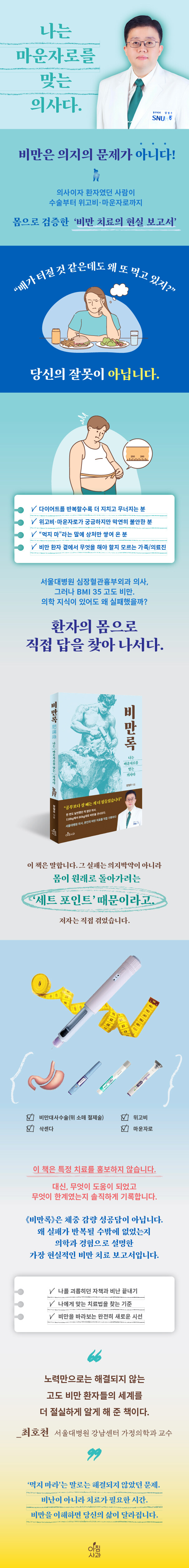 ¿Ü°ú ÀÇ»çÀÌÀÚ °íµµ ºñ¸¸ ȯÀÚ¿´´ø ÀúÀÚ°¡ ÀÚ½ÅÀÇ ¸öÀ¸·Î Åë°úÇÑ »ýÁ¸°ú ȸº¹ÀÇ ±â·ÏÀ» ÀüÇÑ´Ù. ¼ö¸¹Àº ´ÙÀÌ¾îÆ® ½ÇÆÐ¿Í Æø½Ä, ÀÚ±«°¨À» °ÞÀº ³¡¿¡ ºñ¸¸ ´ë»ç ¼ö¼ú°ú GLP-1 À¯»çü Ä¡·á¸¦ °ÅÃÄ ¼ºÀÎ ÀÌÈÄ ÃÖÀú üÁß¿¡ µµ´ÞÇϱâ±îÁöÀÇ °úÁ¤À» ÀÇ»çÀÇ ½Ã¼±À¸·Î ´ã¾Æ³Â´Ù. ÀÌ ±â·ÏÀº üÁß °¨·®±â¸¦ ³Ñ¾î ºñ¸¸ÀÌ ½Åü¿Í Á¤½ÅÀ» ¾î¶»°Ô Áö¹èÇÏ´Â Áúº´ÀÎÁö¸¦ ³ÃÁ¤ÇÏ°Ô Â¤´Â´Ù.