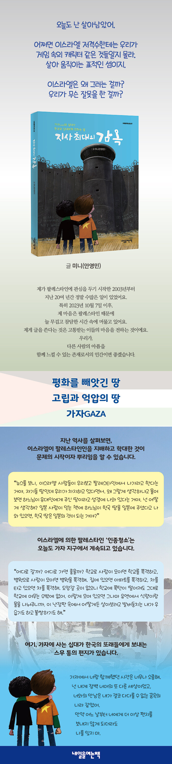 ¹°·Ð ¸¸µé¾î³½ À̾߱â¶ó°í ÇØ¼ »ó»ó¸¸À¸·Î ¾´ °ÍÀº ¾Æ´Ï¿¡¿ä. Ä®¸®µåÀÇ °¡Á·ÀÌ °ÞÀº ¿ª»ç¿¡ °üÇÑ À̾߱â´Â °ü·Ã Ã¥À» ¹ÙÅÁÀ¸·Î ½è¾î¿ä. ¼ö½Ê ¸íÀÇ ¿©¼ºÀÌ ÇÑÁý¿¡¼ Áö³½´Ù´Â À̾߱â´Â À¯¿£¿©¼º±â±¸ÀÇ º¸°í¼¸¦, °¡ÀÚÀÇ ½Ä·® À§±â¿¡ °üÇÑ ³»¿ëÀº UNRWA(À¯¿£ ÆÈ·¹½ºÅ¸ÀÎ ³¹Î±¸È£±â±¸)ÀÇ ÀڷḦ Âü°íÇß¾î¿ä. ÆÈ¿¡ ¾ÆÀ̵éÀÇ À̸§À» ¾²´Â À̾߱â´Â °ü·Ã ´ÙÅ¥¸àÅ͸®¿Í ÆÈ·¹½ºÅ¸ÀÎÀÎÀÇ ÀÎÅͺ並 Âü°íÇß°í¿ä. ¼ö¸¹Àº »ç¿¬ °¡¿îµ¥ °¡Àå ±â¾ï¿¡ ³²´Â °ÍÀº À̽º¶ó¿¤ÀÌ »ìÇØÇÑ ÆÈ·¹½ºÅ¸ÀÎ ¾î¸°ÀÌ Èùµå ¶óÀâÀÌ¿¡¿ä. Èùµå ¶óÀâÀ» ±â¾ïÇÏ°í ½Í¾î¼, ±×°¡ Á׾´ø °úÁ¤ ÀϺθ¦ ¿¾ÆÈ©¹ø ° ÆíÁö ¡®³²°ÜÁø °õ ÀÎÇü¡¯ Æí¿¡ ´ã±âµµ Çß¾î¿ä. (Áß·«)