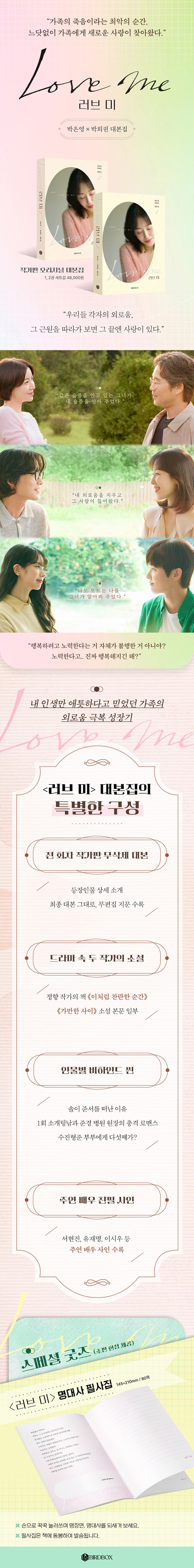 ¡´·¯ºê ¹Ì> ´ëº»ÁýÀº ÀÛ°¡ÀÇ ÃÖÁ¾ ´ëº» ¹«»èÁ¦ÆÇÀ¸·Î ±¸¼ºµÇ¾ú´Ù. óÀ½ ±âȹ ´Ü°è¿¡¼ 16ºÎÀÛÀ̾ú´ø À̾߱Ⱑ 12ºÎÀÛÀ¸·Î ¾ÐÃàµÇ¸ç »èÁ¦µÇ°Å³ª ¼öÁ¤µÈ Àι° ¼³Á¤°ú Àå¸é, ¹æ¼Û¿¡¼´Â º¼ ¼ö ¾ø¾ú´ø ¹Ì°ø°³ ¾ÀµéÀÌ ÇÔ²² ¼ö·ÏµÅ ÀÖ´Ù. ¶ÇÇÑ µå¶ó¸¶¿¡¼ Áß¿äÇÑ ¼ÒÀç·Î »ç¿ëµÇ´Â Á¤Çâ ÀÛ°¡ Ã¥ ¡¶ÀÌó·³ Âù¶õÇÑ ¼ø°£¡·°ú ¡¶°¡¸¸ÇÑ »çÀÌ¡· ÀϺθ¦ ÇÔ²² ½Ç¾î, µå¶ó¸¶ ¼Ó Àι°µéÀÌ ÀÐ°í ¾²´ø ¹®ÀåÀ» µ¶ÀÚµµ Á÷Á¢ ¸¶ÁÖÇÒ ¼ö ÀÖ°Ô Çß´Ù. ÀÌó·³ ¹æ¼Û¿¡¼± °ø°³µÇÁö ¾ÊÀº À̾߱âµéÀ» »ìÆìº¸¸é, ¡´·¯ºê ¹Ì¡µÀÇ ¼¼°è¸¦ ´õ¿í ÀÔüÀûÀ¸·Î ÀÌÇØÇÏ´Â ½Ã°£ÀÌ µÉ °ÍÀÌ´Ù.