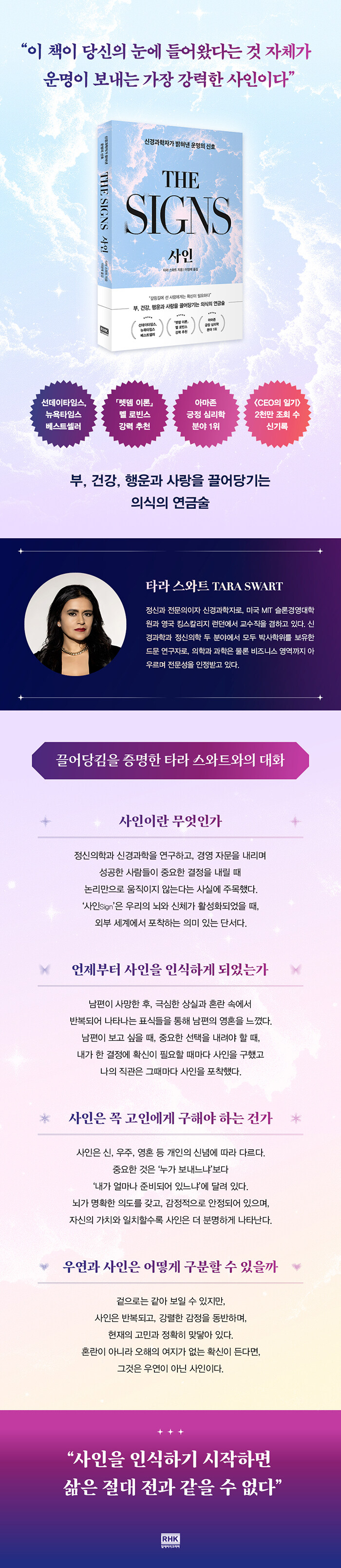 Ÿ¶ó ½º¿ÍÆ®°¡ ÀÌ Ã¥¿¡¼ À̾߱âÇϰíÀÚ ÇÏ´Â ¹Ù´Â ¿ì¸®°¡ ÀÒ¾î¹ö¸° ¡®³»Àû ½ÅÈ£¿¡ ´ëÇÑ ¾Ë¾ÆÂ÷¸²¡¯ÀÌ´Ù. ÀúÀÚ´Â ÁøÈ°úÇаú ½Å°æ°úÇÐ ¿¬±¸ ±×¸®°í ¿À·£ ÀÓ»ó °æÇèÀ» ¹ÙÅÁÀ¸·Î Á÷°ü°ú »çÀÎÀÌ °áÄÚ ¸·¿¬ÇÑ ¹ÏÀ½ÀÌ ¾Æ´Ï¶ó Àΰ£¿¡°Ô ³»ÀçµÈ ÀÎ½Ä ´É·ÂÀÓÀ» ¹àÈù´Ù. ¿ì¸®°¡ »î¿¡¼ ¾òÀº ±³Èưú ¹Ýº¹µÈ ÆÐÅÏ, »çÀεéÀº ¸ö°ú ¹«ÀǽĿ¡ º¸°üµÈ´Ù. ±×¸®°í ¿ì¸®ÀÇ ³ú´Â ÀÌ·¸°Ô ÀúÀåµÈ ÁöÇý°¡ ÇÊ¿äÇÒ ¶§¸¶´Ù ¸öÀÇ °¨°¢, ¹Ýº¹ÀûÀ¸·Î ¸¶ÁÖÇÏ´Â ¼ýÀÚ³ª Ç¥½Ä, ƯÁ¤ »óȲ¿¡¼ ´À²¸Áö´Â ²ø¸²°ú ºÒÆíÇÔÀ¸·Î ½ÅÈ£¸¦ º¸³½´Ù. ±×¸®°í ±×°ÍÀ» Á÷°üÀÌ Æ÷ÂøÇÏ´Â °ÍÀÌ´Ù. ÀÌ Á÷°ü¿¡ ÁÖÀǸ¦ ±â¿ïÀϼö·Ï, ¸ö°ú ȯ°æÀÌ ÀüÇÏ´Â ¸»ÀÌ ´õ Àß ÀÌÇØµÇ°í, »ç¿ëÇÒ ¼ö ÀÖ´Â Áö½ÄÀÇ ÆøÀÌ È®ÀåµÇ¸ç, ´õ ¸¹Àº »çÀÎÀ» ¹ß°ßÇÔÀ¸·Î½á ¿Ã¹Ù¸¥ ÇØ´äÀ» ã¾Æ³¾ ¼ö ÀÖ´Ù.