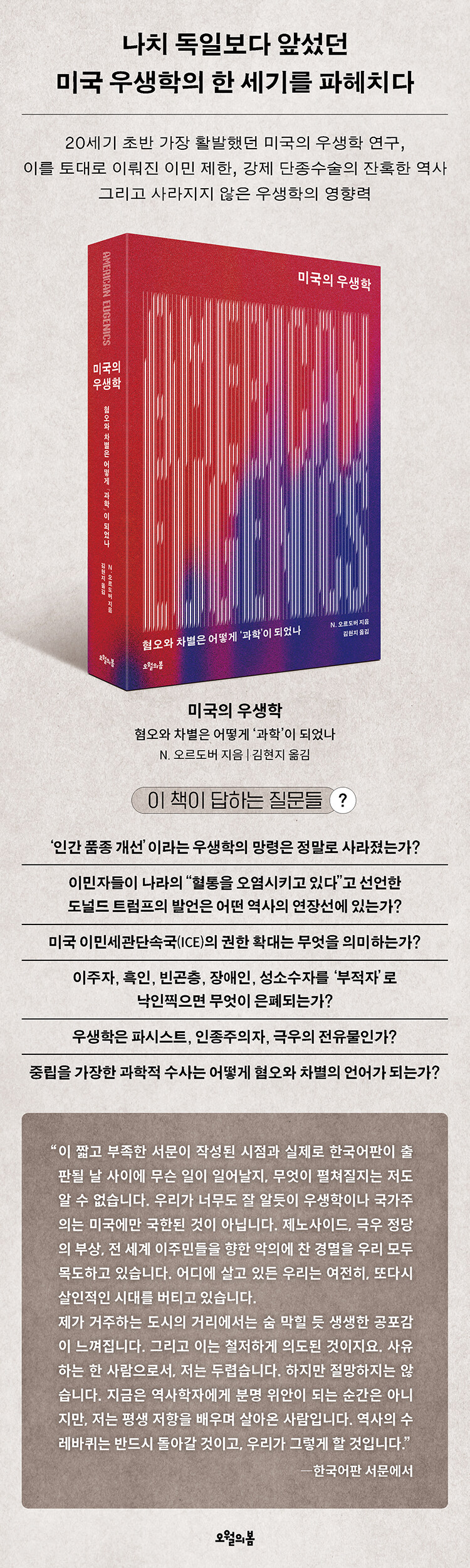 ÀúÀÚ N. ¿À¸£µµ¹ö´Â ¿ì»ýÇÐÀ» ´ÜÁö °ú°ÅÀÇ ±Ø´ÜÀû »ç»óÀ̳ª ½ÇÆÐÇÑ °úÇÐÀ¸·Î ºÀÀÎÇÏÁö ¾Ê´Â´Ù. ±×´Â ¿ì»ýÇÐÀÌ °úÇÐÀû Á߸³¼º°ú ÇÕ¸®¼ºÀÇ ¾ð¾î¸¦ ÅëÇØ ¾î¶»°Ô Çø¿À¿Í Â÷º°À» ±¹°¡ Á¤Ã¥À¸·Î¼ Á¤´çÈÇØ¿Ô´ÂÁö¸¦ ¹¯´Â´Ù. ³ª¾Æ°¡ ÀÌ ¹®Á¦°¡ ¿ì»ýÇÐÀÌ °¡Àå Ȱ¹ßÇß´ø 20¼¼±â ÃÊ ¹Ì±¹¿¡ ±¹ÇѵÇÁö ¾ÊÀ¸¸ç ÇöÀç¿¡µµ ¿©ÀüÈ÷ À¯È¿ÇÏ´Ù°í ÁÖÀåÇÑ´Ù. ÀÌ Ã¥ÀÇ ÀÇÀÇ´Â ¿ª»ç ¼ÓÀ¸·Î »ç¶óÁø, °úÇÐÀ¸·Î¼ÀÇ ¿ì»ýÇÐÀ» Á¶¸íÇÏ´Â °Ô ¾Æ´Ï¶ó ÇüŸ¦ ¹Ù²Ù¾î ¹Ýº¹ÀûÀ¸·Î È£ÃâµÇ¾î¿Â ¿ì»ýÇÐÀÇ ²öÁú±ä »ý¸í·ÂÀ» º¸¿©ÁÖ´Â µ¥ ÀÖ´Ù.