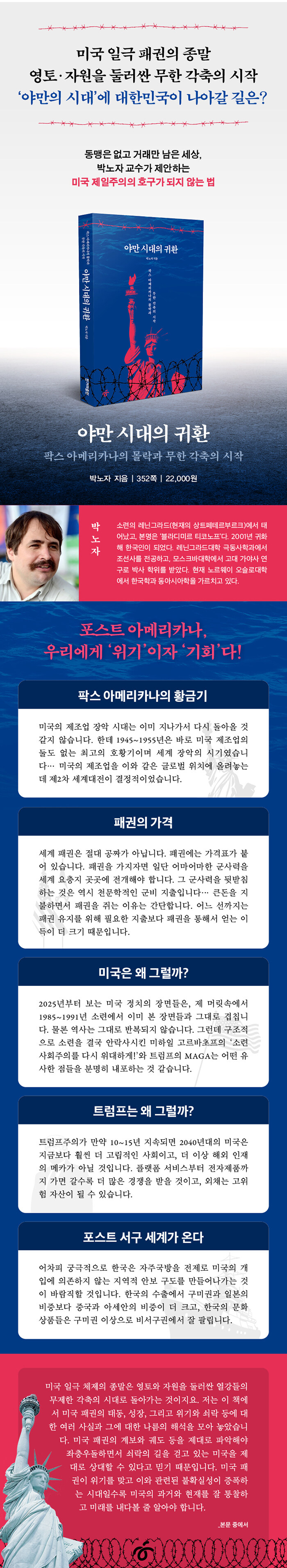 ¡®ÆÅ½º ¾Æ¸Þ¸®Ä«³ª(Pax Americana)¡¯ÀÇ À§±â´Â °ð ¹Ì±¹°ú µ¿¹Ý ±¹°¡ÀÎ ´ëÇѹα¹ÀÇ À§±âÀ̱⵵ ÇÏ´Ù. ÇÏÁö¸¸ ¼Ò·Ã Ãâ½Å Áö½ÄÀÎÀ¸·Î ³ÃöÇÑ ¿ÜºÎÀÚÀÇ ½Ã¼±°ú ¶ß°Å¿î ³»ºÎÀÚÀÇ ºñÆÇ Á¤½ÅÀ¸·Î Çѱ¹ »çȸ¿Í ¼¼°è»çÀÇ À̸éÀ» ³¯Ä«·Ó°Ô ºÐ¼®ÇØ ¿Â ¹Ú³ëÀÚ ±³¼ö´Â ÀÌ ºÒÈ®½Ç¼ºÀÇ ½Ã´ë¸¦ ¡®À§±â¡¯ÀÎ µ¿½Ã¿¡ °Å´ëÇÑ ¡®±âȸ¡¯¶ó°í ¿ª¼³ÇÑ´Ù. ¿ì¸®°¡ ÀÌ ±âȸ¸¦ Æ÷ÂøÇϱâ À§Çؼ´Â °¨»óÀûÀΠģ¹Ì³ª ¸Í¸ñÀûÀÎ ¹Ý¹Ì¸¦ ³Ñ¾î, ¹Ì±¹ ÆÐ±ÇÀÇ °èº¸¿Í ±× ¼è¶ôÀÇ ¸ÞÄ¿´ÏÁòÀ» ³ÃöÇÏ°Ô ÅëÂûÇØ¾ß ÇÑ´Ù.