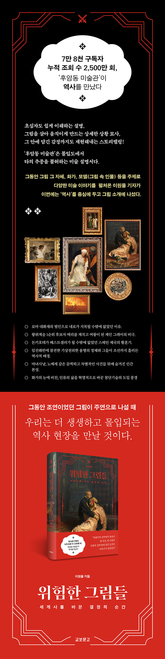 ¡ºÀ§ÇèÇÑ ±×¸²µé¡»¿¡´Â ¼±»ç½Ã´ë Å©·Î¸¶´¨ÀÎÀÌ ±×¸° µ¿±¼º®ÈºÎÅÍ Á¦2Â÷ ¼¼°è´ëÀüÀÇ ¼ö¿ë¼Ò±îÁö, ¿ª»çÀÇ Å« ÀüȯÁ¡ÀÌ µÈ Àå¸é 30°¡Áö°¡ ´ã°Ü ÀÖ´Ù. ¿ª»ç¿¡¼ ±×µ¿¾È Á¶¿¬¿¡ ¸Ó¹°´ø ±×¸²ÀÌ ÁÖ¿¬À¸·Î ³ª¼³ ¶§, ¿ì¸®°¡ ±× ¾È¿¡¼ Àͼ÷ÇÏ°Ô ¾Ë°í ÀÖ´ø ¿ª»çÀû »ç½Ç ¶ÇÇÑ ´Ù¾çÇÑ °üÁ¡¿¡¼ ´Ù½Ã º¸À̱⠽ÃÀÛÇÑ´Ù.
