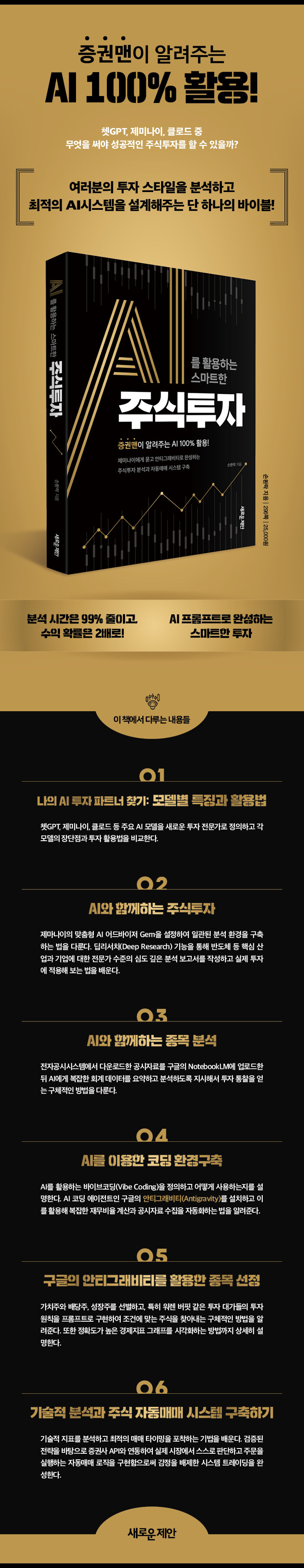 Ã¥ÀÇ Àü¹ÝºÎ¿¡¼´Â AI¸¦ Ȱ¿ëÇÑ ÅõÀÚ ºÐ¼®ÀÇ ±âÃʸ¦ ¼³¸íÇÑ´Ù. Á¦¹Ì³ªÀÌÀÇ ¸ÂÃãÇü ¾îµå¹ÙÀÌÀúÀÎ GemÀ» ¼³Á¤ÇÏ¿© ÀڽŸ¸ÀÇ ÀϰüµÈ ºÐ¼® ȯ°æÀ» ±¸ÃàÇϰí, °Å½Ã °æÁ¦¿¡¼ °³º° ±â¾÷À¸·Î À̾îÁö´Â ºÐ¼® ¹æ½ÄÀ» AI¿Í ÇÔ²² ½Ç½ÀÇÑ´Ù. ƯÈ÷ µö¸®¼Ä¡ ±â´É°ú ±¸±ÛÀÇ NotebookLMÀ» Ȱ¿ëÇÏ¿© °ø½Ã ÀÚ·á¿Í À繫Á¦Ç¥¸¦ Àü¹®°¡ ¼öÁØÀ¸·Î ºÐ¼®Çϰí, ±â¾÷ÀÇ ¼öÀͼº°ú ¾ÈÁ¤¼ºÀ» ²ç¶Õ¾î º¸´Â ÅëÂû·ÂÀ» °¡Áú ¼ö ÀÖ°Ô ÇØÁÖ°í ÀÖ´Ù.