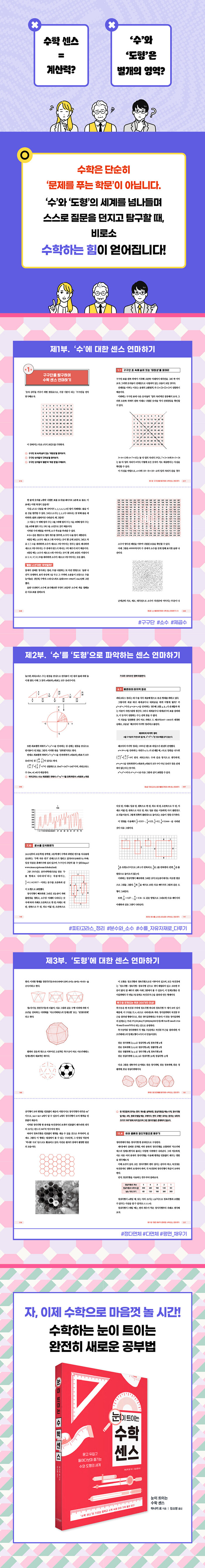 ÀÌ Ã¥¿¡¼ ´Ù·ç´Â ¡®¼öÇÐ ¼¾½º¡¯¶õ ½±°Ô ¸»ÇØ ¡®¼öÇÐÀ» Á¦´ë·Î °®°í ³î ÁÙ ¾Æ´Â °¨°¢¡¯À» ¸»ÇÑ´Ù. ´Éµ¿ÀûÀ¸·Î Áú¹®À» ´øÁö°í À̸®Àú¸® µÚÁý¾îº¸°í ޱ¸ÇÏ¸ç ¼ö¿Í µµÇü¿¡ ¼û¾î ÀÖ´Â Áú¼¸¦ ±íÀÌ ¾Ë¾Æ°¡´Â ´É·Â, À̰ÍÀÌ ¹Ù·Î ¼öÇÐ ¼¾½ºÀÌÀÚ ÁøÁ¤ÇÑ ¡®¼öÇÐÇÏ´Â Èû¡¯ÀÌ´Ù. ¼öÇÐÇÏ´Â ÈûÀÌ Àß ´Ü·ÃµÇ¾î ÀÖ´Ù¸é, ¼öÇÐÀÇ Å« µÎ °¡Áö ÃàÀ̶ó ÇÒ ¼ö ÀÖ´Â ¡®¼ö¡¯¿Í ¡®µµÇü¡¯ÀÌ »ç½ÇÀº º°°³°¡ ¾Æ´Ï¶ó ¼·Î ±ä¹ÐÇÏ°Ô ¿¬°áµÇ¾î ÀÖ´Ù´Â »ç½ÇÀ» Å͵æÇÏ°Ô µÈ´Ù. ¿¹¸¦ µé¾î ¡®ÇÇŸ°í¶ó½ºÀÇ Á¤¸®¡¯¿¡¼´Â ¡®aÀÇ Á¦°ö ´õÇϱâ bÀÇ Á¦°öÀº cÀÇ Á¦°ö¡¯À» ¹«ÀÛÁ¤ ¿Ü¿ì´Â µ¥ ±×Ä¡Áö ¾Ê°í ´õ ³ª¾Æ°¡ ¡®Á¦°ö¼ö¡¯ÀÇ Æ¯Â¡À» ¹ß°ßÇÒ ¼ö ÀÖ´Ù. ¶Ç´Â ºÐ¼ö¸¦ ¼Ò¼ö·Î ¹Ù²Ù°í ¼Ò¼öÁ¡ ÀÌÇÏ¿¡ À̾îÁö´Â ¼ýÀÚµéÀ» µµÇüÀ¸·Î Ç¥ÇöÇØº¸¸é, °Å±â¼ ³î¶ó¿î ´ëμºÀ» ã¾Æ³¾ ¼öµµ ÀÖ´Ù. ÀÌó·³ ¡®¼ö¸¦ µµÇüÀ¸·Î ÀνÄÇÏ°í µµÇüÀ» ¼ö·Î ÀνÄÇÏ´Â °Í¡¯Àº ¼öÇÐÀ» ÇÑ Â÷¿ø ´õ ±íÀÌ ÀÌÇØÇϱâ À§ÇÑ ±âº» ÁßÀÇ ±âº»ÀÌ´Ù.
