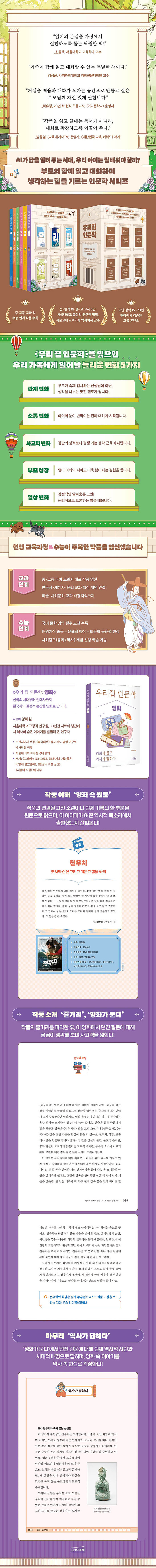 <¿ì¸® Áý Àι®ÇÐ> ½Ã¸®Áî´Â ºÎ¸ð¿Í ¾ÆÀ̰¡ ÇÔ²² ÀÐ°í ´ëÈÇϵµ·Ï À̲ô´Â Àι®±³¾ç¼´Ù. ½Ã, Çѱ¹¼Ò¼³, ¼¼°è¼Ò¼³, öÇÐ, ¸íÈ, ¿µÈ ÃÑ 6±ÇÀ¸·Î ±¸¼ºµÇ¾î ÀÖ´Ù. Àι®ÇÐ ÅØ½ºÆ®¸¦ ¸Å°³·Î ÀÛǰ ¼Ó Áú¹®À» Ãâ¹ßÁ¡À¸·Î »ï¾Æ, ±× ÀÛǰÀÌ Åº»ýÇÑ ¿ª»çÀû ¸Æ¶ô°ú »çȸÀû ¹è°æÀ» ÇÔ²² ޱ¸Çϵµ·Ï ¼³°èµÇ¾ú´Ù. À̸¦ ÅëÇØ µ¶ÀÚ´Â ÀÛǰÀ» ´Ü¼øÈ÷ °¨»óÇÏ´Â µ¥¼ ±×Ä¡Áö ¾Ê°í, ¿Ö ÀÌ·± À̾߱Ⱑ ³ª¿Ã ¼ö¹Û¿¡ ¾ø¾ú´ÂÁö, ±× ½Ã´ë »ç¶÷µéÀº ¹«¾ùÀ» °í¹ÎÇß´ÂÁö¸¦ ÀÔüÀûÀ¸·Î ÀÌÇØÇÒ ¼ö ÀÖ´Ù.