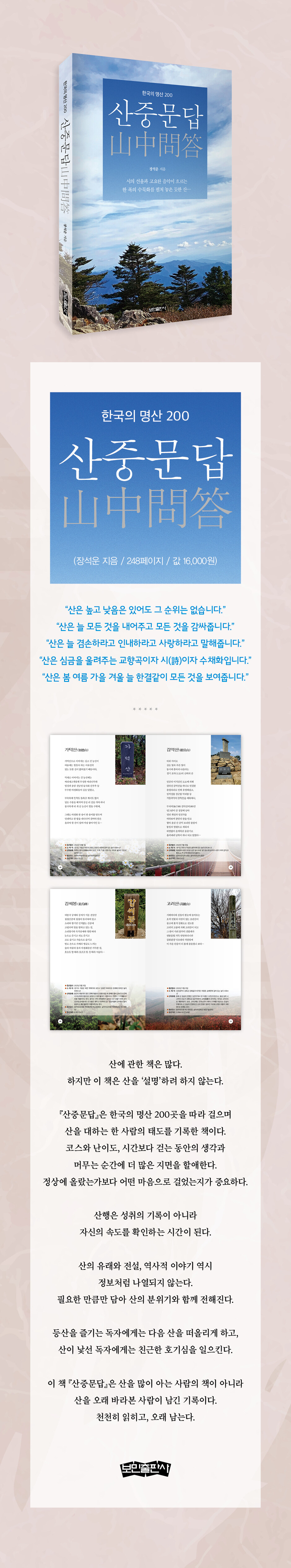 »ê¿¡ °üÇÑ Ã¥Àº ¸¹´Ù. ±×·¯³ª ¡º»êÁß¹®´ä(ߣñéÙýÓÍ)¡»Ã³·³ »ê ¾Õ¿¡¼ ¸»À» ¾Æ³¢´Â ŵµ¸¦ ³¡±îÁö ÁöÄѳ»´Â Ã¥Àº µå¹°´Ù. Àå¼®¿î ÀÛ°¡´Â Áú¹®À¸·Î ½ÃÀÛÇØ ´äÀ» ¼µÎ¸£Áö ¾Ê°í, °ÉÀ½°ú ¼û, ¸Ó¹µ°Å¸² ¼Ó¿¡¼ »çÀ¯¸¦ °¡¶ó¾ÉÈù´Ù. Á¤»óº¸´Ù Áú¹®À» ǰÀº ä °È´Â ½Ã°£À» ÅÃÇÏ´Â ÀÌ ±â·ÏÀº µ¶ÀÚ¸¦ Àá½Ã ¸ØÃç ¼°Ô ÇÑ´Ù.