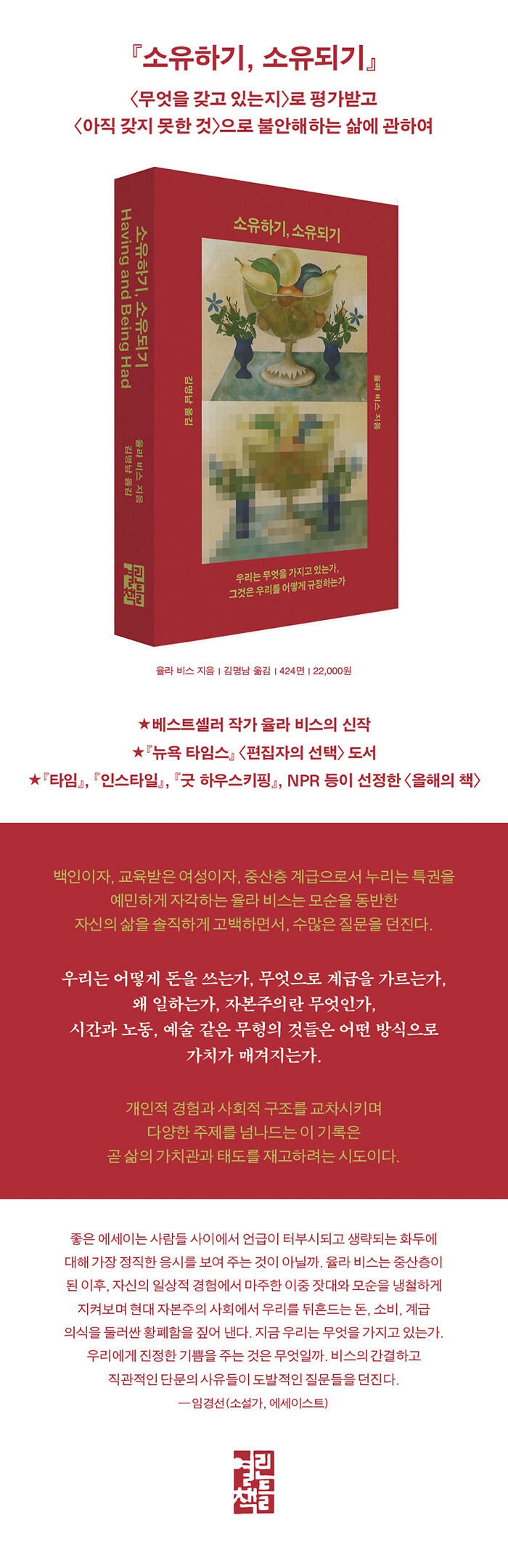 º£½ºÆ®¼¿·¯ ¡º¸é¿ª¿¡ °üÇÏ¿©¡»·Î ÈÁ¦¸¦ ¸ð¾Ò´ø ¹Ì±¹ÀÇ Àú³Î¸®½ºÆ®ÀÌÀÚ ³íÇÈ¼Ç ÀÛ°¡, À²¶ó ºñ½º. ±×°¡ ¿À·£¸¸¿¡ ½Å°£ ¡º¼ÒÀ¯Çϱâ, ¼ÒÀ¯µÇ±â¡»·Î Çѱ¹ÀÇ µ¶ÀÚµéÀ» ´Ù½Ã ã¾Æ¿Ô´Ù. À̹ø¿¡´Â ¡´¼ÒÀ¯¡µ¿¡ ´ëÇÑ À̾߱âÀÌ´Ù. Çö´ë »çȸ¸¦ »ì¾Æ°¡´Â »ç¶÷À̶ó¸é ´ë°³ ¡´¹«¾ùÀ» °®°í ÀÖ´ÂÁö¡µ·Î Æò°¡¹Þ°í, µ¿½Ã¿¡ ¡´¾ÆÁ÷ °®Áö ¸øÇÑ °Í¡µÀ¸·Î ºÒ¾ÈÇØÇÑ´Ù. Áý, Á÷Àå, ÀÚ»ê °°Àº ÁöÇ¥µéÀº ¾î´Àµ¡ ´Ü¼øÇÑ °æÁ¦Àû ¿©°ÇÀ» ³Ñ¾î, ¡´³»°¡ ¾î¶² »ç¶÷Àΰ¡¡µ¸¦ Áõ¸íÇÏ´Â ±Ù°Å°¡ µÇ¾ú´Ù. ÀÌ Ã¥Àº ¹Ù·Î ±× ÁöÁ¡¿¡¼ Ãâ¹ßÇÑ´Ù. ¡´¿ì¸®´Â ¹«¾ùÀ» °¡Áö°í Àִ°¡, ±×°ÍÀº ¿ì¸®¸¦ ¾î¶»°Ô ±ÔÁ¤Çϴ°¡.¡µ