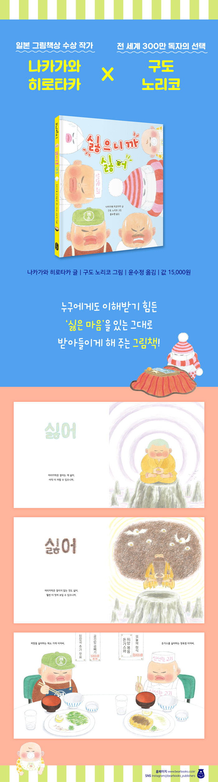 ±×·³¿¡µµ ¾î¸°ÀÌ¿¡°Ô ¡®½È¾î¡¯·Î °¡µæÇÑ ±×¸²Ã¥À» º¸¿© ÁÖ´Â °ÍÀÌ ÁÖÀúµÈ´Ù¸é ¸¶Áö¸· ÀåÀ» ÆîÃĺ¸ÀÚ. ¡°½È¾î, ½È¾î. ½ÈÀº °Íµµ ½È¾î. ½È´Ù°í ÇÏ´Â °Íµµ ½È¾î. ½ÈÀ¸³Ä°í ¹¯´Â °Íµµ ½È¾î.¡± ±ÛÀº ÆøÇ³Ã³·³ ºÒÆòÀ» ½ñ¾Æ³»°í ÀÖÁö¸¸, ±×¸²Àº ´Ù¸¥ À̾߱⸦ ÇÑ´Ù(¾î¶² À̾߱⸦ Çϰí ÀÖ´ÂÁö´Â Á÷Á¢ È®ÀÎÇØ º¸½Ã±æ). ³ª¾Æ°¡ ±Û°ú ±×¸²ÀÌ ¾î¿ì·¯Áö¸ç ÀÚ½ÅÀ» ¼ÖÁ÷ÇÏ°Ô µå·¯³¿À¸·Î½á ŸÀΰú ´õ °Ç°ÇÏ°Ô ¿¬°áµÉ °¡´É¼ºÀ» ½Ã»çÇÑ´Ù. 300±Ç °¡±î¿î ±×¸²Ã¥¿¡ ±ÛÀ» ¾²°í ¾î¸°À̸¦ À§ÇÑ ³ë·¡¸¦ ¸¸µé¾î ¿Â ±Û ÀÛ°¡, Àü ¼¼°è 300¸¸ µ¶ÀÚÀÇ »ç¶ûÀ» ÇÑ ¸ö¿¡ ¹Þ°í ÀÖ´Â ±×¸² ÀÛ°¡ÀÇ ³»°ø(?)À» ¹Ï¾î º¸½Ã¶ó!