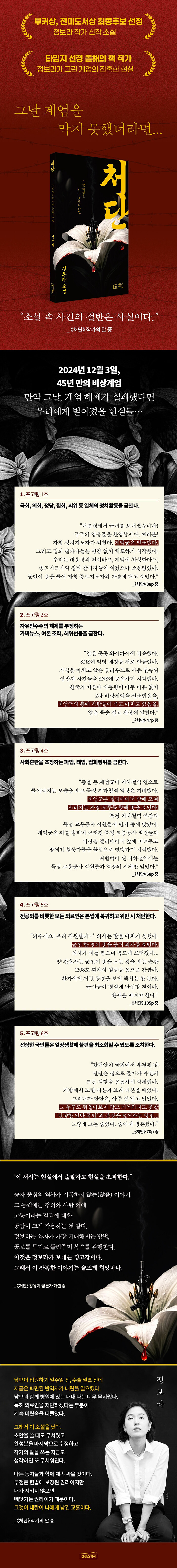 ¡ºÃ³´Ü¡»Àº 2024³â 12¿ù 3ÀÏ °è¾öÀ» ±×¸®°í ÀÖ´Ù. ´ëÇѹα¹ Á¦20´ë ´ëÅë·ÉÀÌ ºñ»ó°è¾öÀ» ¼±Æ÷ÇÑ ÈÄ ¹«ÀåÇÑ ±º º´·ÂÀ» µ¿¿øÇØ ±¹È¸¸¦ ºñ·ÔÇÑ Çå¹ý±â°üÀ» ¹«·ÂÈÇß°í, ÀÌ¿¡ ¹Ý¹ßÇÏ´Â ½Ã¹ÎÀ» °ø°ÝÇÏ·Á°í ½ÃµµÇ߱⠶§¹®ÀÌ´Ù. ºñ»ó°è¾öÀº 6½Ã°£¸¸¿¡ ÇØÁ¦µÇ¾úÁö¸¸, ±× ¸î ½Ã°£Àº ´©±º°¡ÀÇ ÀÏ»ó°ú »î, ÀǹÌ, °¡Ä¡, ½Ã°£ÀÌ ¸ØÃß°í Çã¹°¾îÁö´Â µ¥ ºÎÁ·ÇÏÁö ¾Ê¾Ò´Ù. ±×¸®°í ±× ½Ã°£À» ÀÛ°¡ Á¤º¸¶ó°¡ Ä¡¹ÐÇÏ°Ô ´ã¾Æ³½ ¼Ò¼³ÀÌ ¡ºÃ³´Ü¡»ÀÌ´Ù.
