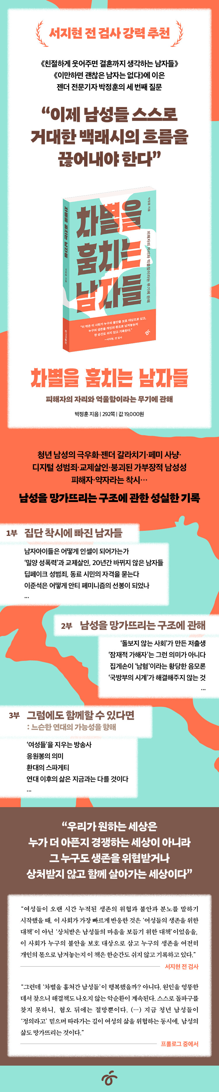 ÀúÀڴ ù Ã¥ ¡¶Ä£ÀýÇÏ°Ô ¿ô¾îÁÖ¸é °áÈ¥±îÁö »ý°¢ÇÏ´Â ³²Àڵ顷À» ÅëÇØ Æä¹Ì´ÏÁòÀÌ ½Ã´ëÁ¤½ÅÀ¸·Î ¶°¿À¸¥ »óȲ¿¡¼ ³²¼ºµéÀÌ ±âÁ¸°ú´Â ´Ù¸£°Ô »ì¾Æ¾ß ÇÔÀ» Ã˱¸Çß°í, µÎ ¹øÂ° Ã¥ ¡¶À̸¸ÇÏ¸é ±¦ÂúÀº ³²ÀÚ´Â ¾ø´Ù¡·¿¡¼´Â ³²¼ºµé¿¡°Ô ½º½º·ÎÀÇ ¡®±ú¾î ÀÖÀ½¡¯¿¡ ¸¸Á·ÇÏÁö ¸»°í ¡®¼ºº° À̺йý¡¯À» Èçµå´Â µ¥±îÁö ³ª¾Æ°¡ÀÚ°í ¿ª¼³Çß´Ù. ±×¸®°í Æä¹Ì´ÏÁò 3ºÎÀÛÀÇ Á¾Âø¿ªÀÎ ÀÌ Ã¥¿¡¼´Â ¾Õ¼± µÎ Ã¥ÀÌ ³²¼ºµé¿¡°Ô ¿ÂÀüÈ÷ ´Ù°¡°¡Áö ¸øÇßÀ½À» ¹Ý¼ºÇϸé¼, ³²¼ºµé ½º½º·Î °Å´ëÇÑ ¹é·¡½ÃÀÇ È帧À» ²÷¾î³»¾ß ÇÑ´Ù°í °£ÀýÈ÷ È£¼ÒÇÑ´Ù.