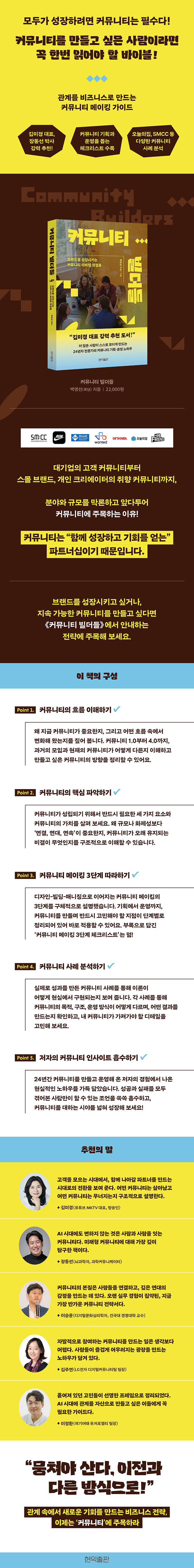 ´ë±â¾÷ÀÇ °í°´ Ä¿¹Â´ÏƼ, ¼ºÀåÀ» À§ÇÑ ÀÚ±â°è¹ß Ä¿¹Â´ÏƼ, ÃëÇ⺰ Ä¿¹Â´ÏƼ µî »ç¶÷ÀÌ ¸ðÀÎ °÷À̶ó¸é °¡¸®Áö ¾Ê°í ´Þ·Á°¡´Â ±¹³» ÃÖ°í Ä¿¹Â´ÏƼ Àü¹®°¡ÀÇ ½ÇÀü Ä¿¹Â´ÏƼ °¡À̵å. LGÀüÀÚÀÇ ¶óÀÌÇÁÁý, ±è¹Ì°æ ´ëÇ¥ÀÇ MKYU, ÇÁ¸³, Æ®·¹¹Ù¸® ºÏŬ·´ µî¿¡¼ Ä¿¹Â´ÏƼ¸¦ ±âȹÇÏ°í ¿î¿µÇØ ¿Â ÀúÀÚ°¡ ¿Ö Áö±Ý Ä¿¹Â´ÏƼ¿¡ ÁÖ¸ñÇØ¾ß ÇÏ´ÂÁö, Ä¿¹Â´ÏƼ¶õ ¹«¾ùÀÎÁö, ¾î¶»°Ô Ä¿¹Â´ÏƼ¸¦ ºôµùÇÏ°í ¸Å´Ï¡ÇÏ´ÂÁö¿¡ ´ëÇØ ½±°í ¸íÈ®ÇÏ°Ô ¾È³»ÇÑ´Ù. Ä¿¹Â´ÏƼ¶õ ¡®°ü°è¡¯¸¦ ´Ù·ç´Â ºñÁî´Ï½º´Ù. ´Ü¼øÇÑ È«º¸ ¼ö´ÜÀ̳ª °í°´ °ü¸® µµ±¸¸¦ ³Ñ¾î¼ ºê·£µå¿Í ¼ÒºñÀÚ°¡ ÇÔ²² ¼ºÀåÇÏ°í »õ·Î¿î ±âȸ¸¦ ¾ò´Â °¡´É¼ºÀÇ °ø°£À̱⵵ ÇÏ´Ù. ¡ºÄ¿¹Â´ÏƼ ºô´õµé¡»Àº ¿À´ÃÀÇÁý ¿ÀÇϿ콺, ³ªÀÌŰ NRC, ¼¿ï¸ð´×Ä¿ÇÇŬ·´ µî ´Ù¾çÇÑ »ç·Ê¸¦ ¹ÙÅÁÀ¸·Î »ç¶÷µéÀÌ Ä¿¹Â´ÏƼ¿¡ ¿Ö ¸ðÀÌ°í ¸Ó¹«¸£¸ç ¾î¶»°Ô ¿òÁ÷ÀÌÁö¸¦ ÀÔüÀûÀ¸·Î ºÐ¼®ÇÑ´Ù. ¶ÇÇÑ Àá±ñ ³ªÅ¸³µ´Ù°¡ »ç¶óÁöÁö ¾Ê°í ¿À·¡ Áö¼ÓµÇ´Â Ä¿¹Â´ÏƼ¸¦ ¿î¿µÇÏ´Â ³ëÇϿ쵵 ¾Æ³¦¾øÀÌ ´ã¾Ò´Ù. ÃëÇâÀ» Áß½ÉÀ¸·Î ÀÛÀº ¸ðÀÓÀ» ²Ù¸®°í ½ÍÀº °³ÀÎ, ÆÈ·Î¿ö¸¦ Ä¿¹Â´ÏƼ·Î ¼ºÀå½ÃŰ°í ½ÍÀº Å©¸®¿¡ÀÌÅÍ, °í°´°ú ÇÔ²²ÇÏ¸ç ½Ã³ÊÁö¸¦ ¾ò°í ½ÍÀº ±â¾÷ Ä¿¹Â´ÏƼ ´ã´çÀÚ µî Ä¿¹Â´ÏƼ¿¡ °ü½É ÀÖ´Â »ç¶÷À̶ó¸é ¸ðµÎ ÀÌ Ã¥À» ÅëÇØ »õ·Î¿î °üÁ¡ÀÇ ÀλçÀÌÆ®¸¦ ¾ò°í ºê·£µå¸¦ ¼ºÀå½Ãų ¼ö ÀÖÀ» °ÍÀÌ´Ù.