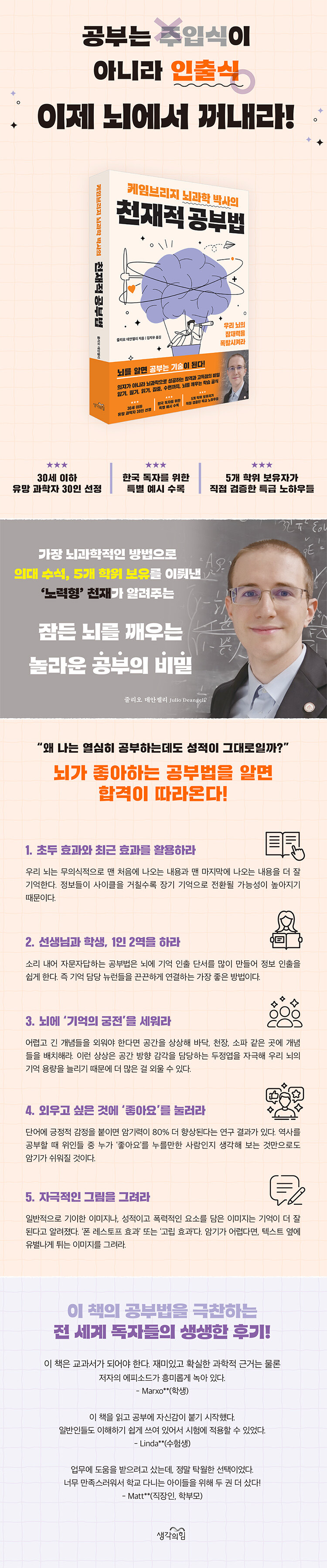 ¡ºÄÉÀӺ긮Áö ³ú°úÇÐ ¹Ú»çÀÇ ÃµÀçÀû °øºÎ¹ý¡»Àº ¿ì¸®°¡ °¡Áø À߸øµÈ °øºÎ¹ý¿¡ ´ëÇÑ Åë³äÀ» ¹Ù·ÎÀâ°í, ³úÀÇ ¿ø¸®¿Í ÀÛµ¿ ¹æ½ÄÀ» ÆÄ¾ÇÇØ °¡Àå °úÇÐÀûÀÎ Áö¸§±æÀ» ¾Ë·ÁÁÖ´Â ÃÖÀûÀÇ ±æÀâÀÌ´Ù. °¢ À帶´Ù ¡°±â¾ïÀÌ Àß ¾È ³ª´Â °Ç ¸Ó¸®°¡ ³ªºü¼Àϱî?¡± ¡°º¹½ÀÀ» ¸¹ÀÌ ÇÒ¼ö·Ï È¿°úÀûÀϱî?¡± µî ¿ì¸®°¡ ±Ã±ÝÇß´ø Áú¹®µé¿¡ ´ëÇÑ ´äÀ» Ãֽгú°úÇÐÀû ±Ù°Å¿Í ±×¸²À» ÅëÇØ¼ ¼³¸íÇϰí, ¡®1,000ÀÚ¸® ¼ýÀÚ¶óµµ ÇÑ ¹ø¿¡ ¾Ï±âÇÏ´Â ¹ý¡¯ ¡®ÇÏÀ̶óÀÌÆ®¿Í ¹ØÁÙ Á¦´ë·Î Ä¡´Â ¹ý¡¯ µî ²À ÇÊ¿äÇÑ Àü·«µéÀ» ¼Ò°³Çϰí ÀÖ´Ù. ƯÈ÷ ÀÌ·± Àü·«µéÀº ÇÐâ½ÃÀýºÎÅÍ ÀúÀÚ°¡ Á÷Á¢ °ËÁõÇÏ¿© °á±¹ ÀÇ´ë ¼ö¼® Á¹¾÷Àº ¹°·Ð ´Ù¼¸ °³ ÇÐÀ§±îÁö ¼ºÃëÇÒ ¼ö ÀÖ¾ú´Ù´Â Á¡¿¡¼ ´õ¿í ½Å·ÚÇÒ ¼ö ÀÖ´Ù. ÀÌ Ã¥Àº Ưº°È÷ Çѱ¹ µ¶ÀÚ¿¡°Ô Àͼ÷ÇÑ ¿¹½Ã¸¦ ´Þ¾Æ ÀÌÇØ¸¦ µ½°í ½ÃÇè¿¡¼ ½±°Ô Àû¿ëÇÒ ¼ö ÀÖ°Ô Çß´Ù. ³ª¾Æ°¡ ¼ö¸é, ¿îµ¿, ½ºÆ®·¹½º °ü¸® µî ÃÖÀûÀÇ °øºÎ ȯ°æÀ» ¸¸µå´Â ¹ý±îÁö Ä£ÀýÇÏ°Ô ¾È³»Çϰí ÀÖ¾î ¼öÇè»ýÀº ¹°·Ð ´õ ³ªÀº ±³À°¹ýÀ» °í¹ÎÇÏ´Â ±³À°ÀÚ, ÀÚ³àÀÇ ¼ºÀûÀÌ °í¹ÎÀÎ Çкθ𿡰ԱîÁö ²À ÇÊ¿äÇÑ Ã¥ÀÌ µÉ °ÍÀÌ´Ù.